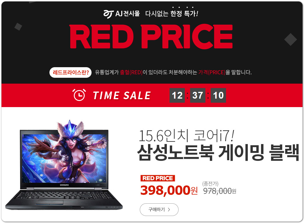 전시몰에 들어가보니 RED PRICE라고 '다시없는 한정특가'가 진행중입니다. 레드프라이스는 한마디로 마진은 커녕 출혈이 있지만 어쩔수없이 급히 처분을 해야해서 한정기간으로 상품을 판매하는 것입니다. 왠지 그럴싸하네요. 97.8만원짜리 15.6인치 코어i7 게이밍 노트북을 단돈 39.8만원에 판매하는 엄청난 특가! 당장이라도 클릭해서 빨리 사고 싶네요.