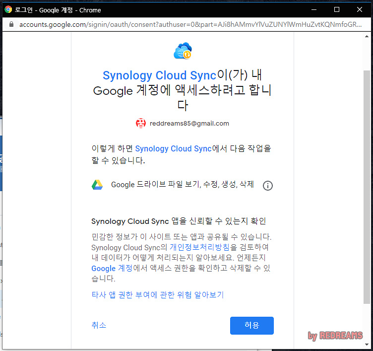 중요한 점은, 시놀로지나스의 클라우드 싱크는 클라우드에 올려진 파일을 단방향으로 다운만 받는 것이 아니란 것 입니다. 보기,수정,생성,삭제 권한에서 볼 수 있듯이 내 NAS폴더에서 수정한 파일이 자동으로 구글드라이브로 동기화 되는 양방향 기능도 포함하고 있습니다. 구글드라이브에 접속하지 않고도 NAS에서, 내컴퓨터에서 탐색기로 바로바로 구글드라이브 파일을 생성하고 수정할 수 있습니다.