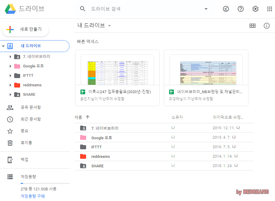 일단 제가 사용하는 구글드라이브입니다. 사실 시놀로지나스를 쓰고있기 때문에 별도로 드라이브를 유료로 사용할 필요는 없지만 다른 목적때문에 유료버전을 이용중입니다. 아래와 같이 여러폴더들이 있고 개인목적으로, 업무목적으로 10여명 이상이 공동으로 사용하고 있죠. 공동으로 사용하고 있기 때문에 누군가가 실수로 파일을 삭제하거나 이동할때 발생할 이슈도 고민하지 않을 수 있습니다. 심지어 파일이 많아지면 검색도 힘들어지죠. 자 바로 클라우스 싱크로 구글드라이브를 백업해보도록 하겠습니다.