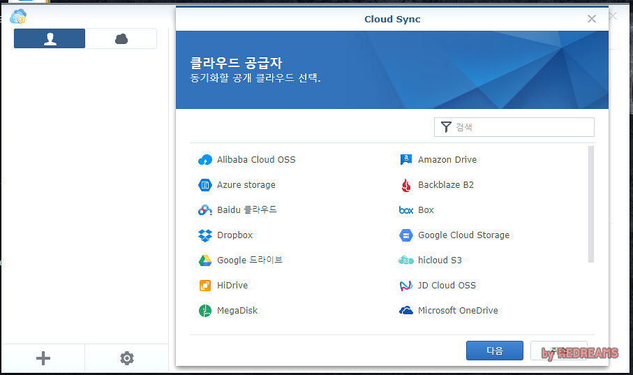 클라우드 싱크를 실행하면 아래와 같은 창이 나옵니다. 앞서 말씀드린 것처럼 오늘은 구글드라이브를 백업하겠지만 보시는 것처럼 아마존드라이브,박스,드롭박스,원드라이브 등 전세계 내로라하는 대부분의 클라우드 서비스가 있습니다. 아무조건없이 내가 이용중인 모든 클라우드를 자유롭게 백업할 수 있습니다.