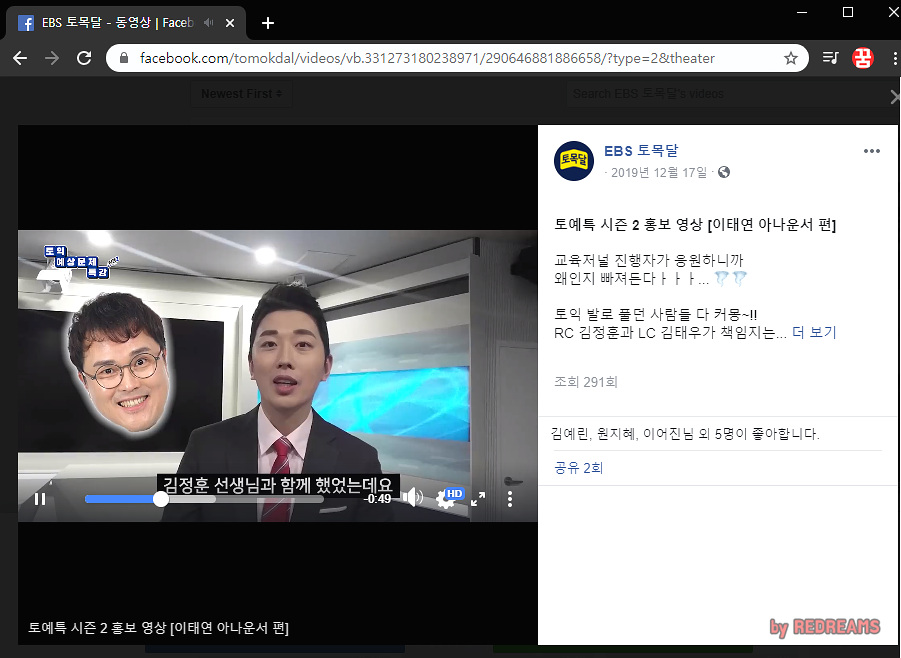 먼저 다운로드 받고 싶은 페이스북 동영상의 url을 확인합니다. 보통 영상을 시청하게 되면 아래와 같이 주소창에 뜨는 url이 바로 영상의 주소가 됩니다. EBS토목달의 토익예상문제특강 홍보영상이네요. 이 영상을 다운로드 받아보겠습니다.