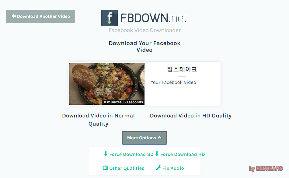 영상주소를 넣으면 아래와 같이 섬네일과 제목이 나오면서 영상이 제대로 불러와지게 되는데요. 이제 다운 버튼만 누르면 됩니다. 하단의 more options 버튼을 클릭합니다. 그러면 왼쪽으로 force download SD, 오른쪽에는 force Download HD 버튼이 보입니다. 왼쪽버튼을 누르면 저화질로 다운로드가 되고, 오른쪽 버튼을 누르면 고화질로 다운로드가 됩니다.