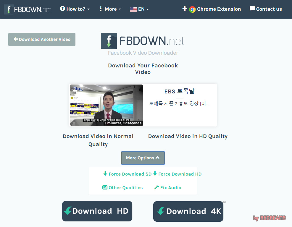 FBDOWN 사이트에서 URL을 입력한 후 다운로드 버튼을 클릭하니 역시나 5초만에 페이스북에 있는 동영상이 내 컴퓨터로 다운로드 되었습니다.