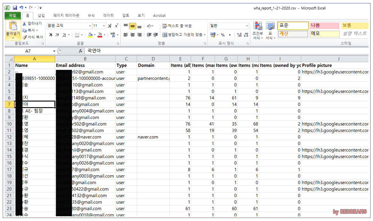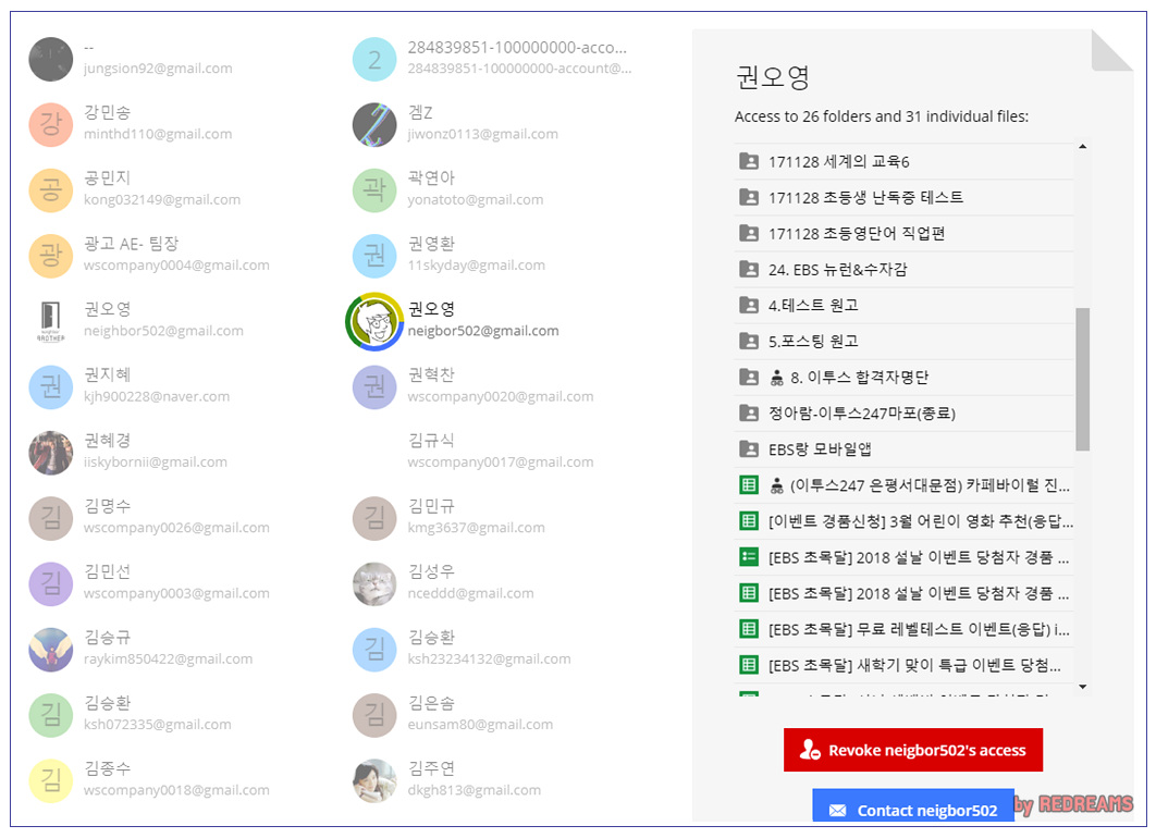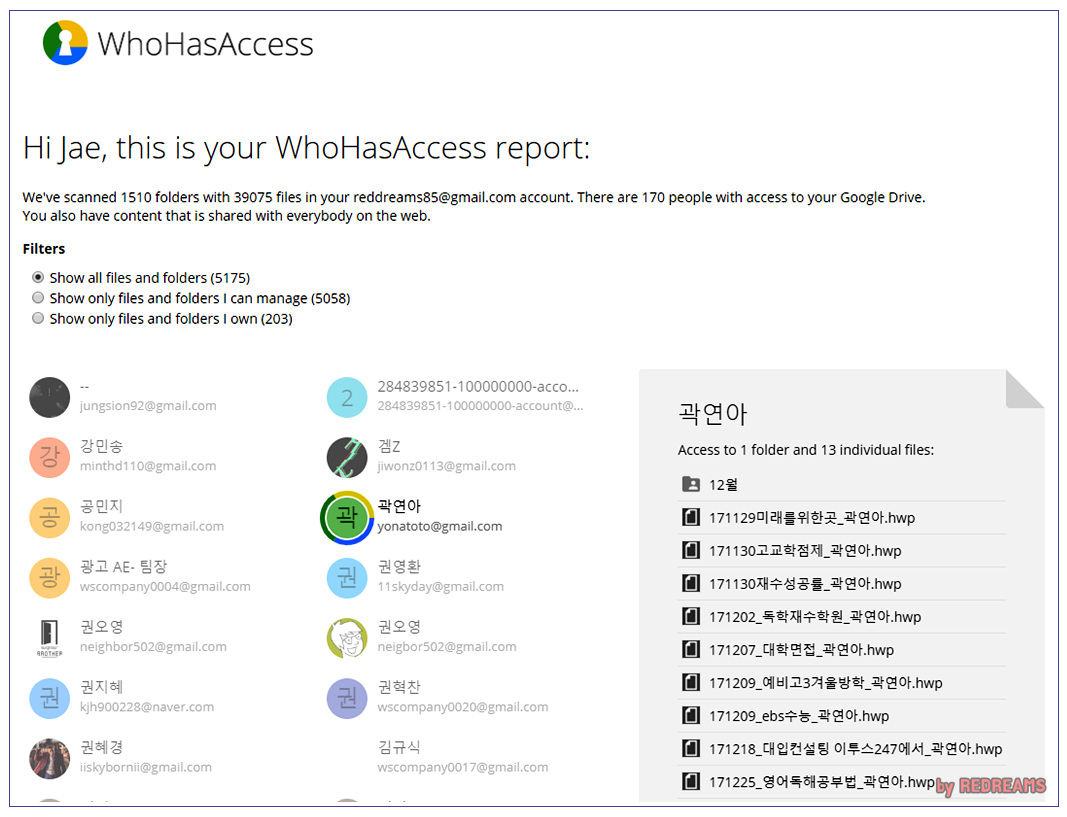 문서 파일을 열어보니 아래와 같이 구글문서 접근권한이 있는 전체 170여명의 이름과 이메일주소 권한을 받은 파일과 폴더 개수가 보여집니다. 프로필 픽쳐까지도 보여지므로 구글계정을 이용하는 사용자라면 누군지 헷갈리지 않고 권한 철회작업을 진행할 수 있을 것 입니다.