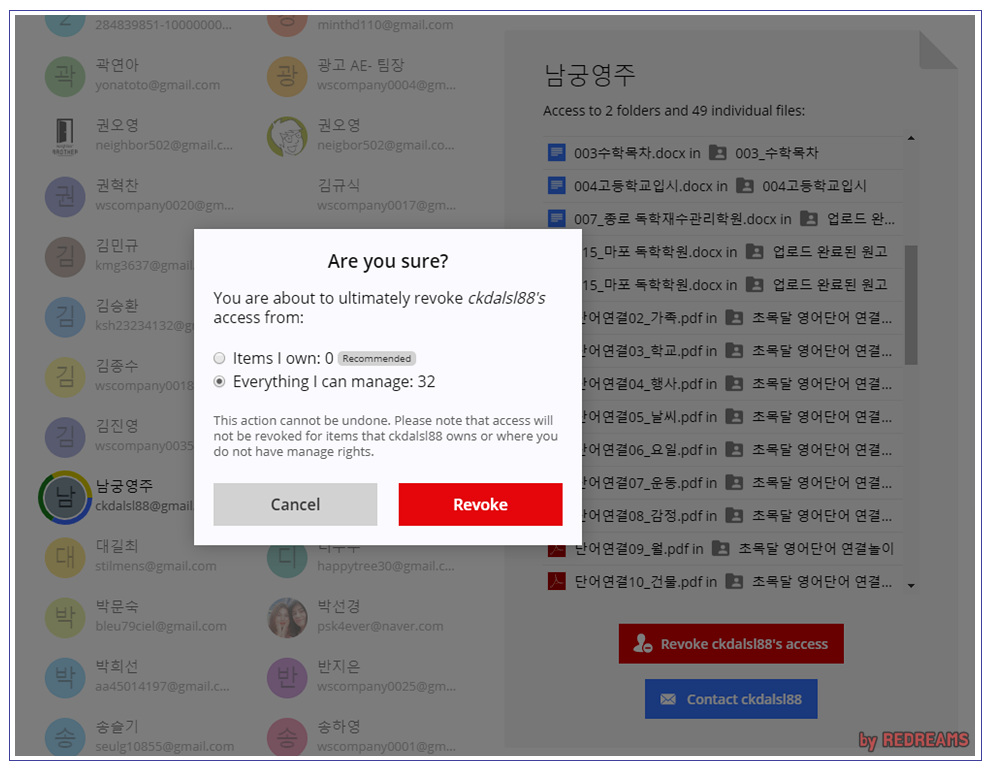 단순히 누가 권한을 가지고 있는지만 보여주면 뭔가 아쉽겠죠? 이 목록에서 사용자를 선택해서 바로 문서 접근 권한을 회수하는 기능도 있습니다. 매번 각 폴더마다, 파일마다 공유정책에 들어가서 작업을 하지 않아도 WhoHasAccess 툴을 이용하면 한번에 약 170명에게 설정된 공유권한을 제거할 수 있음을 뜻합니다. Revoke Access 즉, 접근권한철회 버튼을 누르면 아래와 같이 해당 사용자에게 부여된 모든 파일,폴더 접근 권한이 제거됩니다. 공유가 되고 있지만 사용자의 정체를 모를때는 Contact 기능을 이용해서 그 사람에게 이메일을 보내는 것도 가능합니다. (당연하겠지만 내가 소유하고 있지 않은 문서는 당연히 revoke 기능이 제공되지 않습니다.)