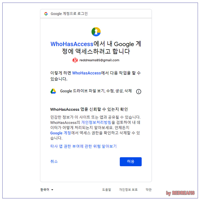 구글 드라이브 파일보기,수정,생성,삭제의 권한이 구글에 요청됩니다.