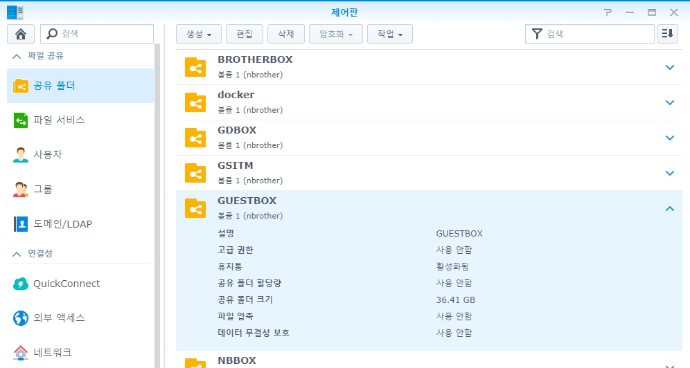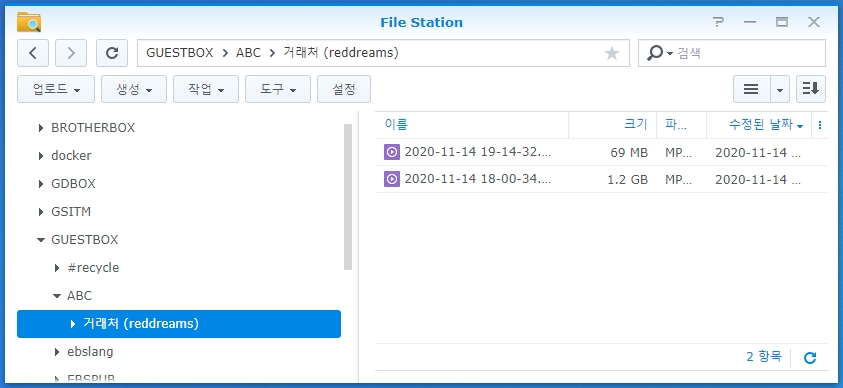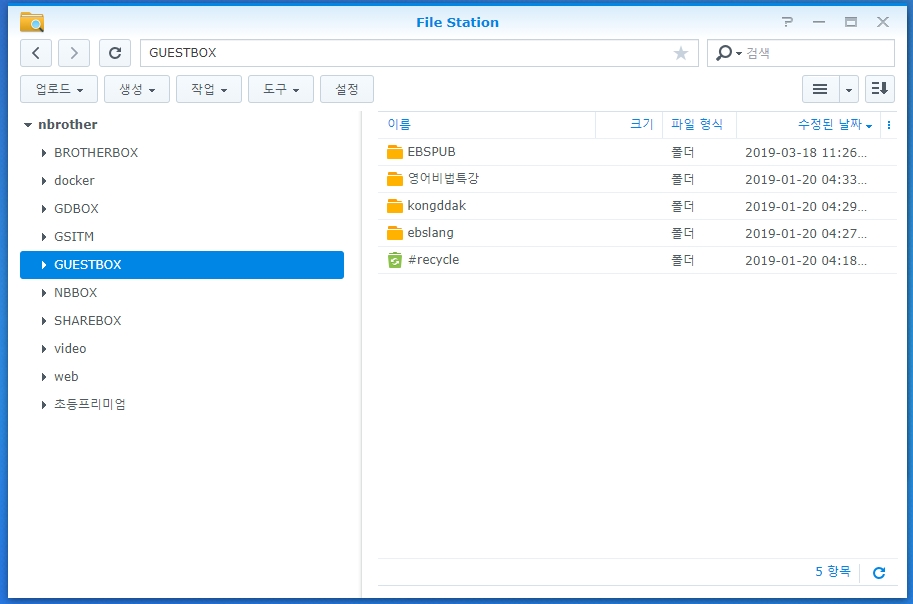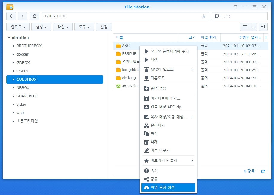 시놀로지 NAS에 생성된 원하는 공유폴더에 자유롭게 파일 생성을 요청할 수 있지만 업무목적으로 명확하게 사용하기 위해서 필자는 아래와 같이 GUESTBOX라는 폴더를 생성해두었습니다. 이 폴더의 목적은 외부 업체(광고주,클라이언트,거래처 등) 외부 게스트들에게 파일 업로드를 요청하기 위함입니다.