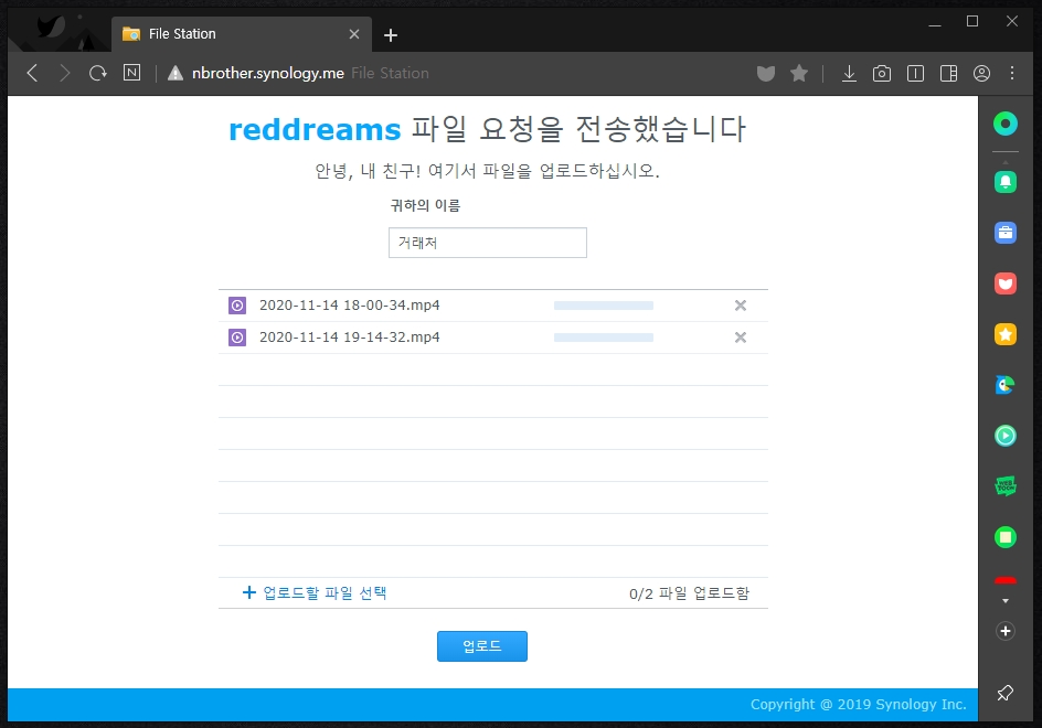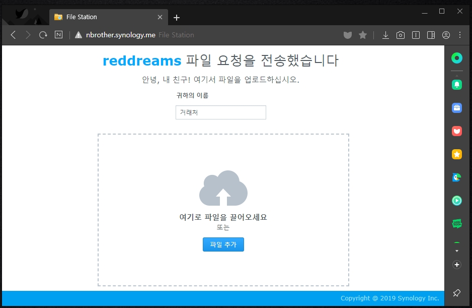 오늘은 시놀로지 나스를 통해 외부에서 대용량 파일을 손쉽게 받아보는 '파일 요청 생성'기능에 대해서 알아보았습니다. 4G 이상 대용량 파일도 이제는 이메일로 주고받지 말고 NAS를 통해 손쉽게 공유받으시기 바랍니다. 그럼 다음 시간에 보다 유용한 시놀로지 나스 활용팁을 가지고 오도록 하겠습니다.