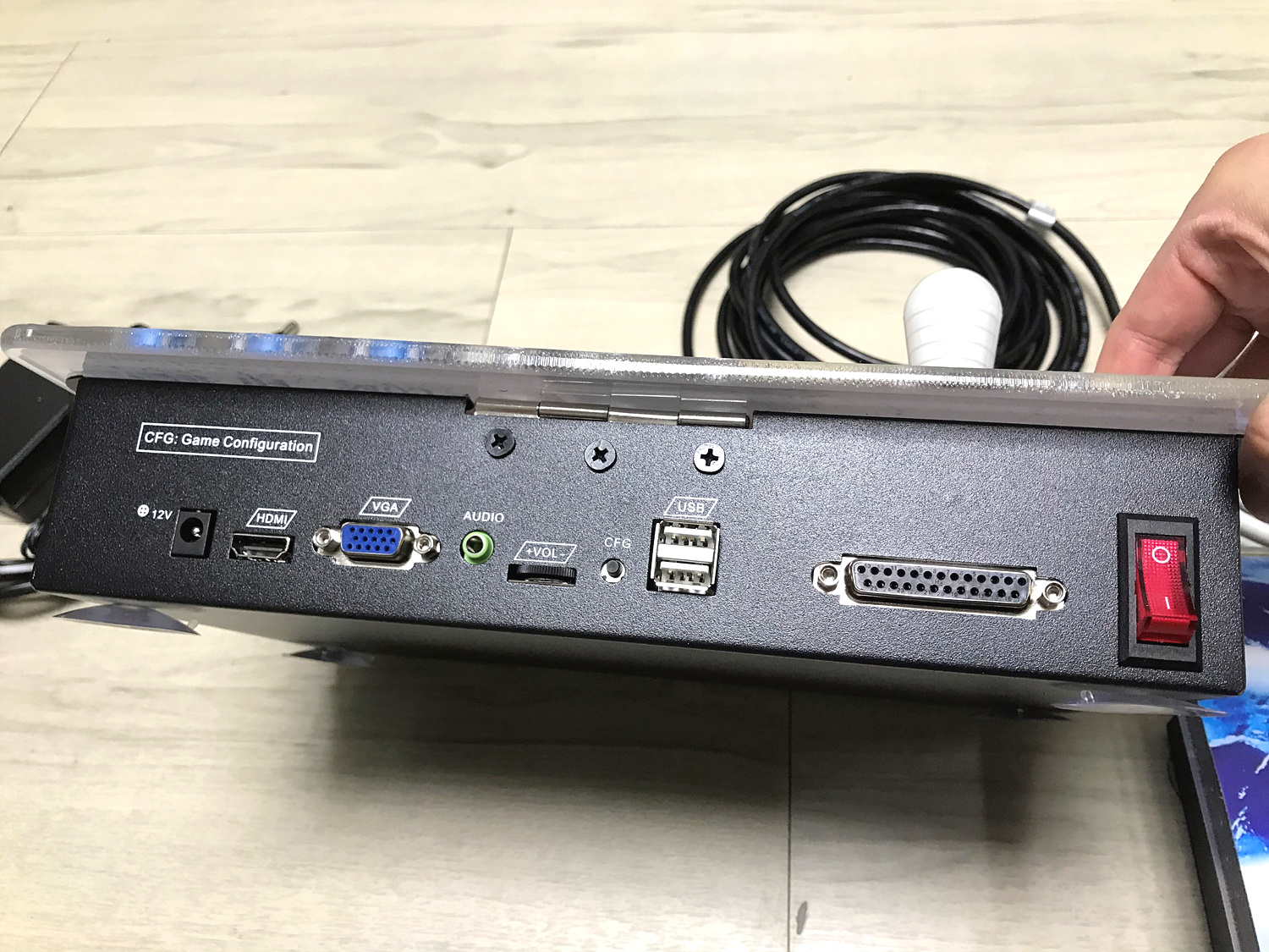 1P 뒷면에는 전원연결포트, HDMI, VGA, AUDIO, 볼륨, CFG, USB, 2P 확장선, 전원 버튼이 자리 잡고 있습니다. 전원선은 필수이며 보통 집 TV로 연결을 할 것이니 HDMI만 TV랑 연결하면 화면과 오디오 모두 제어가 가능합니다. 즉, VGA, AUDIO, VOL 기능은 사용하지 않습니다. 또한, CFG는 게임 환경설정인데 일반적인 경우라면 이용하지 않고 USB 역시 관리 및 게임추가용이라곤 하지만 실제 게임 메모리는 기기 안에 메모리카드로 삽입되어 있으니 전원선과 TV랑 연결하는 HDMI만 연결되어 있으면 모든 준비는 끝납니다.