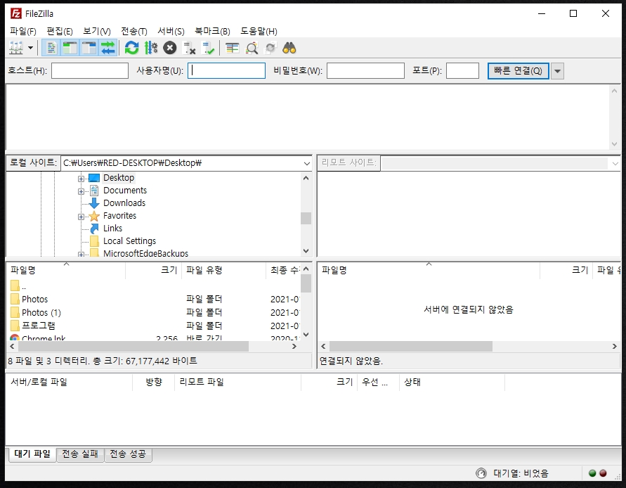 파일질라 FTP 프로그램을 실행하면 아래와 같이 창이 뜹니다. 상단에는 연결계정, 그 아래로는 연결 히스토리, 하단 좌측은 접속하고 있는 로컬 사이트 폴더와 파일명, 하단 우측으로는 연결되어 있는 리모트 사이트 폴더와 파일명이 보입니다. 파일질라가 아닌 다른 FTP 프로그램도 호스트, 사용자명, 비밀번호, 포트 입력 화면이 보일 텐데요. 여기서 내 NAS 계정 정보를 입력해주시면 됩니다.