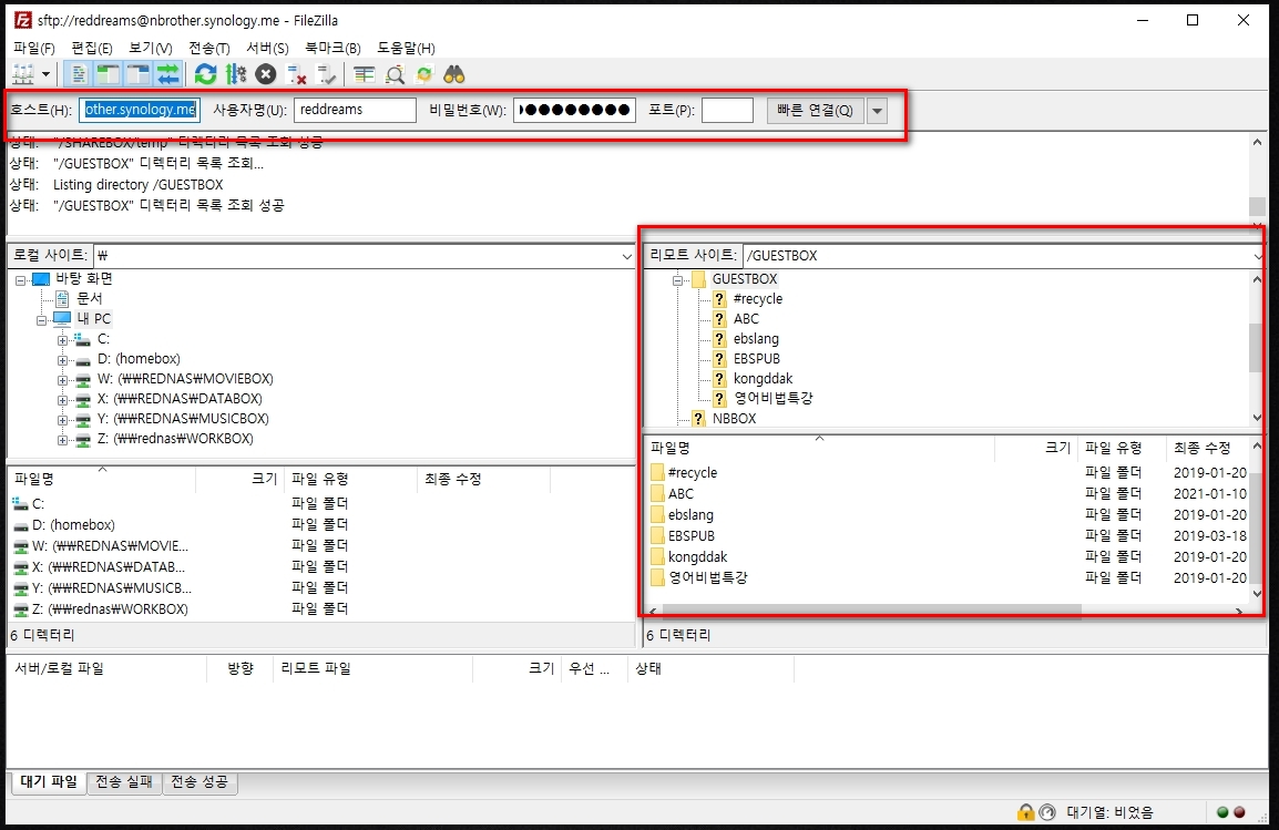 자 그럼 시놀로지 NAS 계정을 입력하고 연결을 클릭해봅니다. (본 포스팅의 연결 환경은 회사에 있는 NAS를 집에서 파일질라로 연결한 것입니다. 당연히 내부 네트워크가 아니며 회사 공유기에는 별도로 포트 포워딩을 하지 않았습니다.) 오른쪽 하단 리모트 사이트 쪽으로 회사 NAS의 모든 폴더 정도와 파일명이 노출됩니다. 당연하겠지만 앞서 설명드렸던 것처럼 해당 계정에 FTP 접속 권한이 없으면 연결이 안 되고, 해당 계정에 접근이 허용된 폴더만 노출이 됩니다.