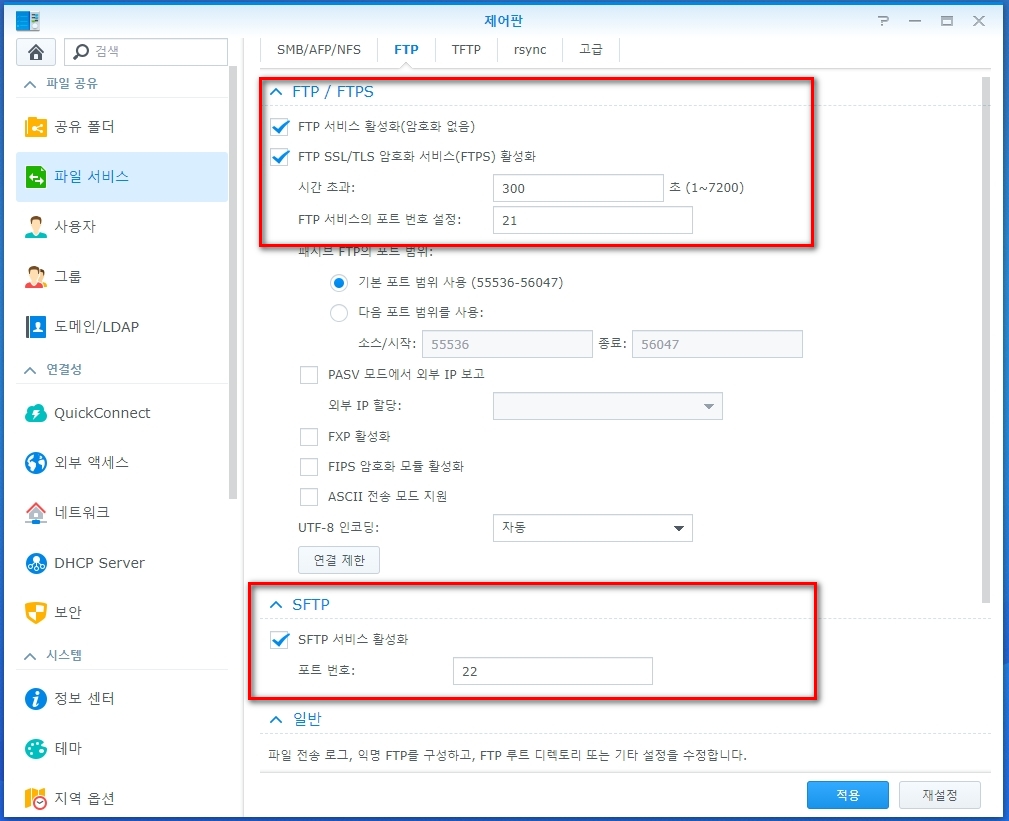 먼저 시놀로지 나스 제어판에서 '파일서비스'를 클릭합니다. 이 곳에서 FTP탭으로 들어가서 FTP 서비스와 SFTP 활성화, FTP SSL/TLS암호화 서비스를 체크합니다. FTP 포트번호가 21로 맞춰져 있을 텐데 안 바꾸셔도 되고 바꾸셔도 됩니다. FTP와 SFTP는 별도의 프로토콜인데 일반 FTP보다는 보안이 강화된 SFTP를 활용하시는 것을 권장해드립니다.