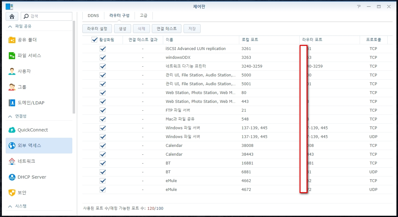 또한, '라우터구성'탭에서 라우터가 어떻게 구성되어있고 연결 테스트 결과가 어떤지 확인할 수 있습니다. 이 곳에서 'FTP 파일서버' 항목이 정상적으로 활성화되어 있는지 포트가 잘 구성되어 있는지 체크해주시면 됩니다.
