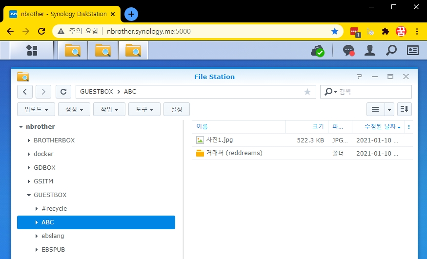 웹으로 시놀로지 나스에 접속했습니다. 그리고 GUESTBOX를 보니 ABC라는 폴더가 생성되어 있으며 FTP 프로그램에서 업로드한 파일이 정상적으로 잘 올려져 있네요. FTP프로그램으로 파일업로드 작업을 하니 꽤나 편하네요.