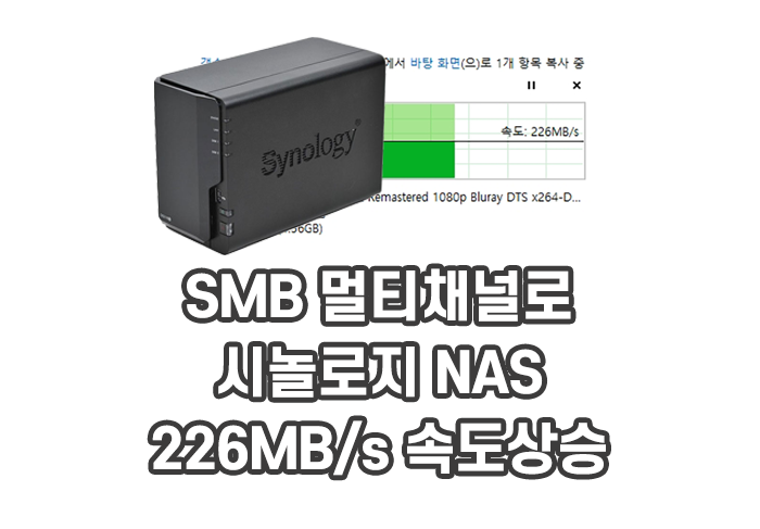 필자는 시놀로지 NAS를 이용하면서 데이터 작업을 많이 합니다. 고용량 파일들을 많이 다룬다는 뜻인데요. 오래전 인터넷 회선이 100m일때도 아무런 불편함이 없었던 같은데 500G로 회선 속도를 올리고 그 후 1G로 회선 속도를 올렸습니다. 그런데도 사람의 욕심이 끝이 없는지라 무료 100MB/s가 제공되는 1G 속도로도 부족함을 많이 느끼게 됩니다. 그래서 듀얼랜포트 SMB 멀티채널로 NAS와 PC간 속도를 최대 226MB/s 올렸습니다. 오늘은 그 방법을 소개해드리고자 합니다.