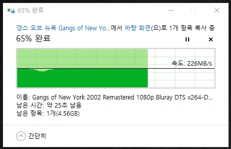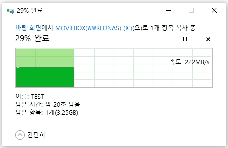 SMB3 멀티채널이 활성화되면 NAS에서 컴퓨터로 파일을 이동시킬 때, 컴퓨터에서 NAS로 파일을 이동시킬때 아래와 같이 속도가 최대 226MB/s가 나오게 됩니다. (5G영화 파일 전송에 약 25초 소요) 아래 속도는 앞서 설명드린 네트워크가 제공하는 속도에 디스크가 대응할 때를 기준으로 합니다.(바이트 환산시 숫자는 125mb/s이지만 어디까지나 이론 숫자이며 실제 최대치라 불리는 113이라는 값을 기준으로 합니다.) 디스크 속도가 따라오지 못한다면 1G최대 속도인 113MB/s는 넘기겠지만 226MB/s는 충족하지 못할 수도 있습니다.