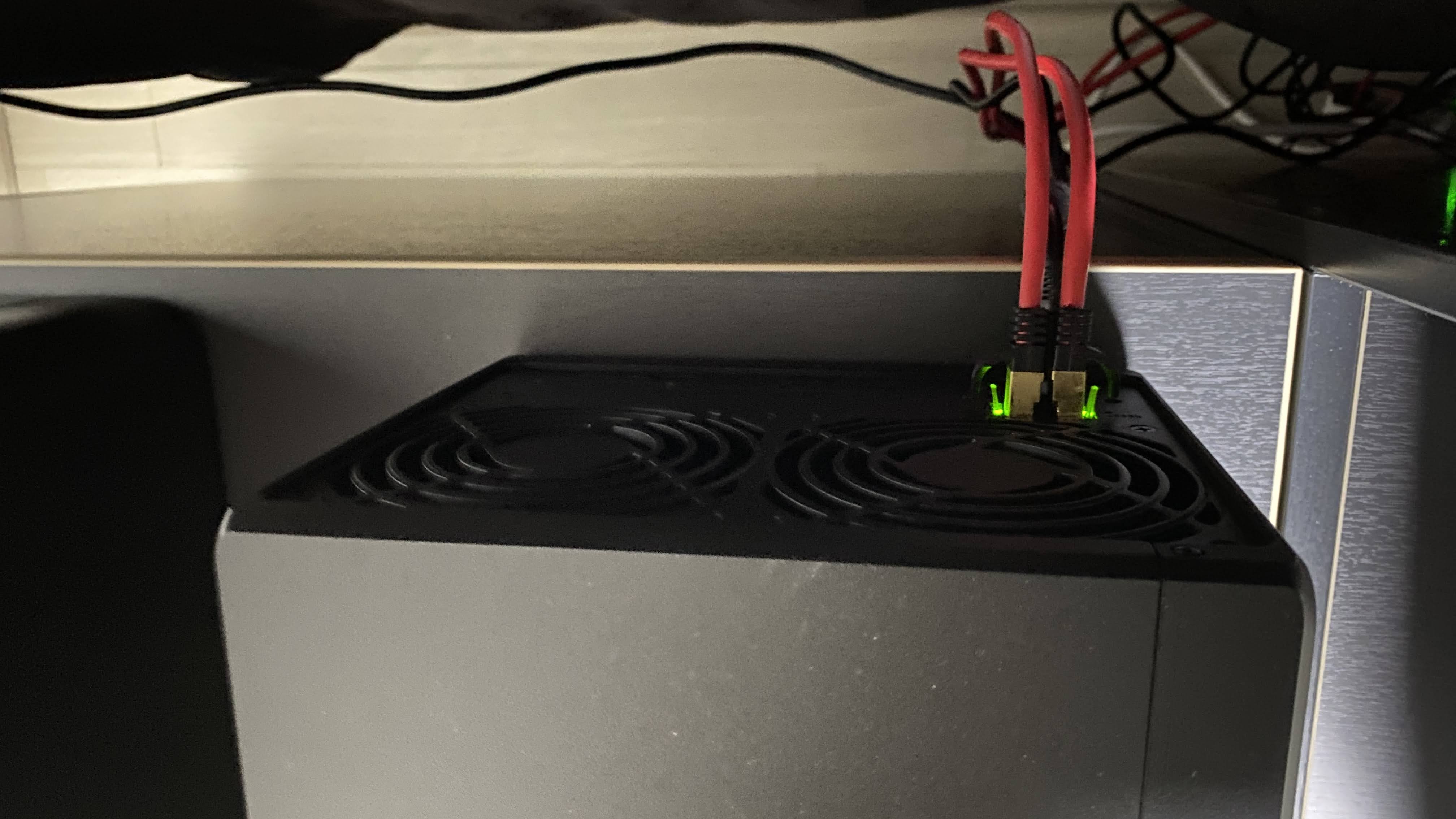 또한, NAS는 DS920+이므로 랜포트가 총 2개입니다. 이렇게 컴퓨터에서 나오는 랜선 2개, NAS에서 나오는 랜선 2개를 모두 동일한 허브에 연결했습니다. (반드시 같은 공유기/허브에 컴퓨터와 NAS가 직접 연결되어야 합니다.)