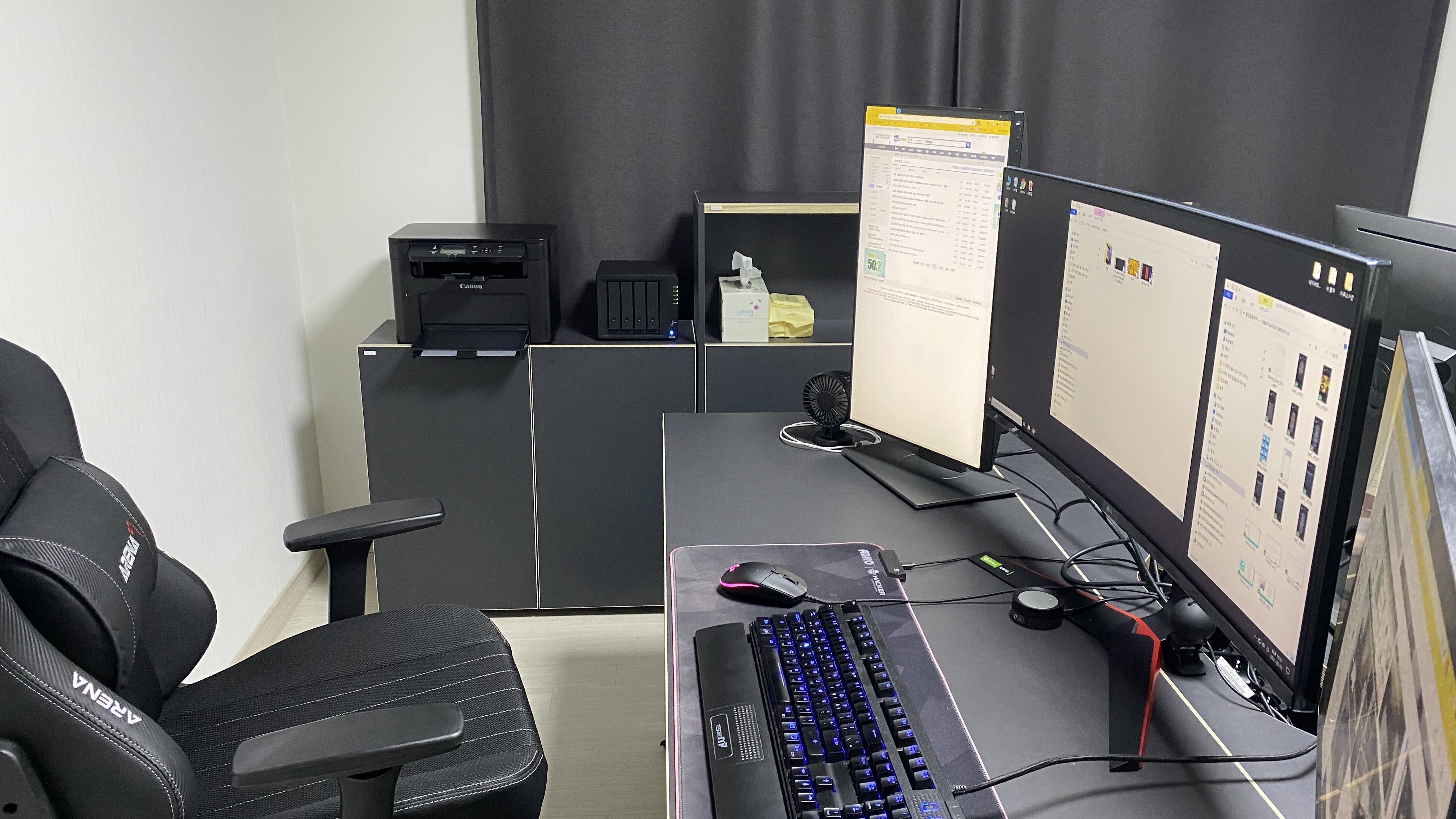 컴퓨터 방에는 컴퓨터, NAS, 복합기 + 추가 컴퓨터 작업을 위한 노트북과 모니터 등이 있습니다. 컴퓨터에 설치된 디스크는 SSD MVME, NAS에 설치된 디스크는 NAS용 시게이트 아이언울프 HDD로 2개 장비 모두 226MB/s 대응이 가능합니다.