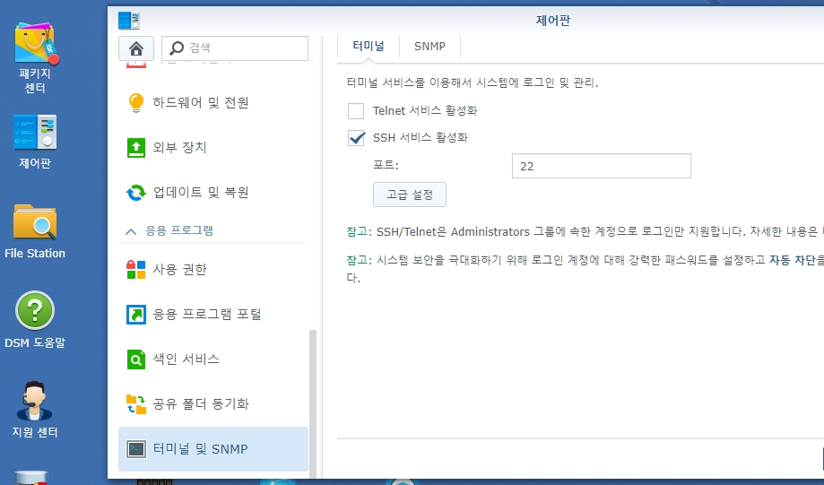 제어판 > 터미널 및 SNMP > 터미널 > SSH 서비스 활성화 체크하고 적용을 누릅니다.