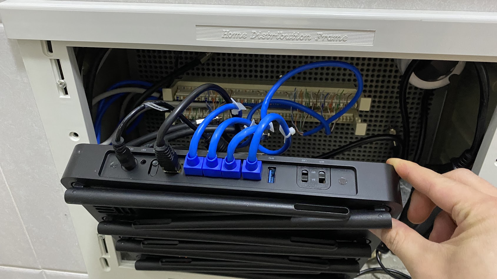 필자는 엘지유플러스 1G서비스를 이용 중입니다. 빌라 1층 공동출입구에 통신단자함이 있는데 그 곳에서 인터넷선이 현관 신발장으로 올라오게 됩니다. 이 곳에 아래 보시는 랜단자가 있는데 외부망이 오는 인터넷선을 공유기에 연결하고 나머지 포트는 각 방으로 배선을 연결했습니다.