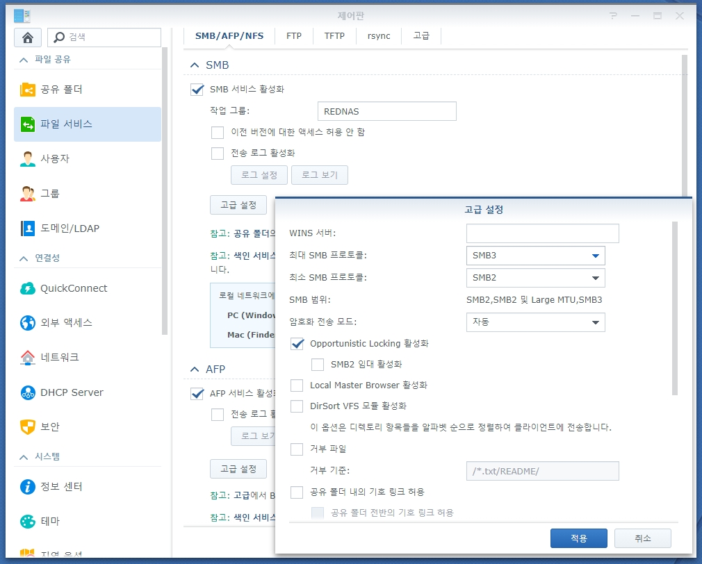 4. 마지막으로 시놀로지 NAS의 제어판에서 SMB 세팅 작업입니다.