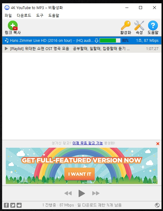 마찬가지로 유튜브 영상 URL을 복사한 후 프로그램에서 '링크복사'버튼을 눌러주면 아무 제약 없이 다운로드가 시작됩니다.
