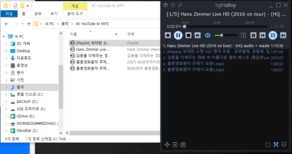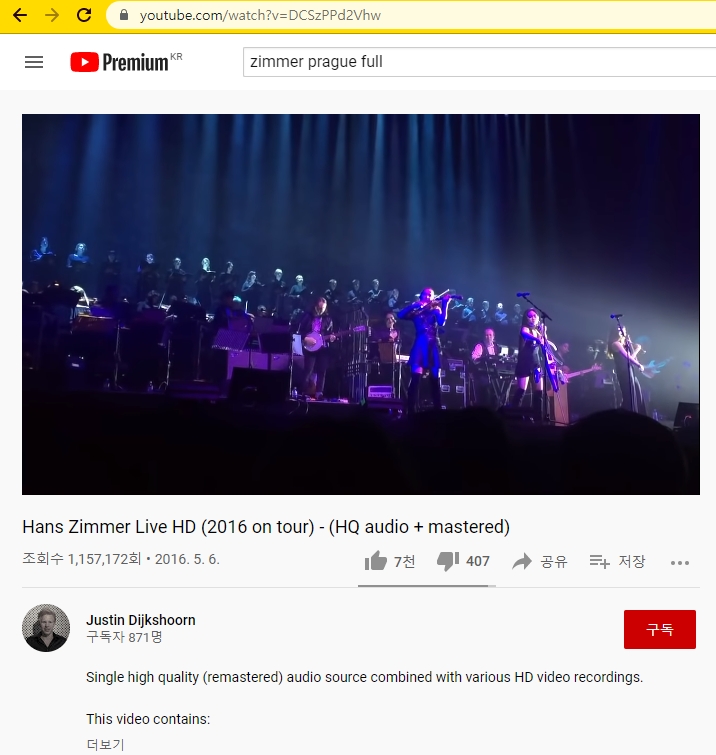 이번에는 국내에서 구하기 힘든 1시간이 넘는 한스짐머의 라이브 영상을 오디오로 다운로드 받아보았습니다.