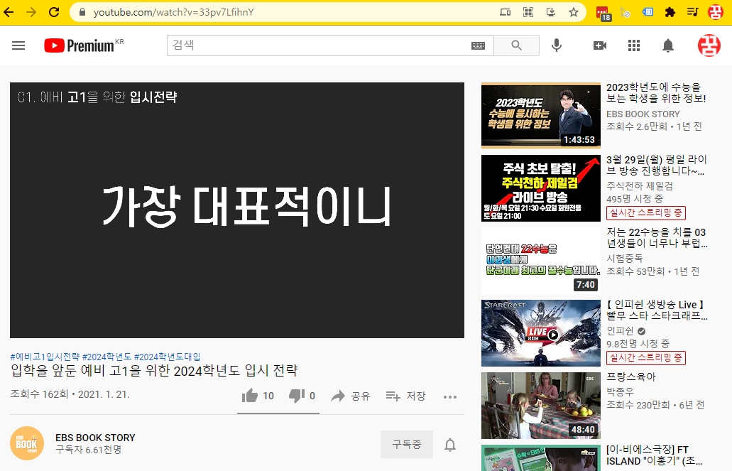 사용방법은 매우 간단합니다. PC로 즐겁게 유튜브 영상을 시청하시다가 다운로드 받고 싶은 영상을 만납니다. 2024학년도 입시전략일 다루고 있는 EBS BOOK STORY채널이 영상으로 가볍게 해당 영상 주소를 복사합니다.