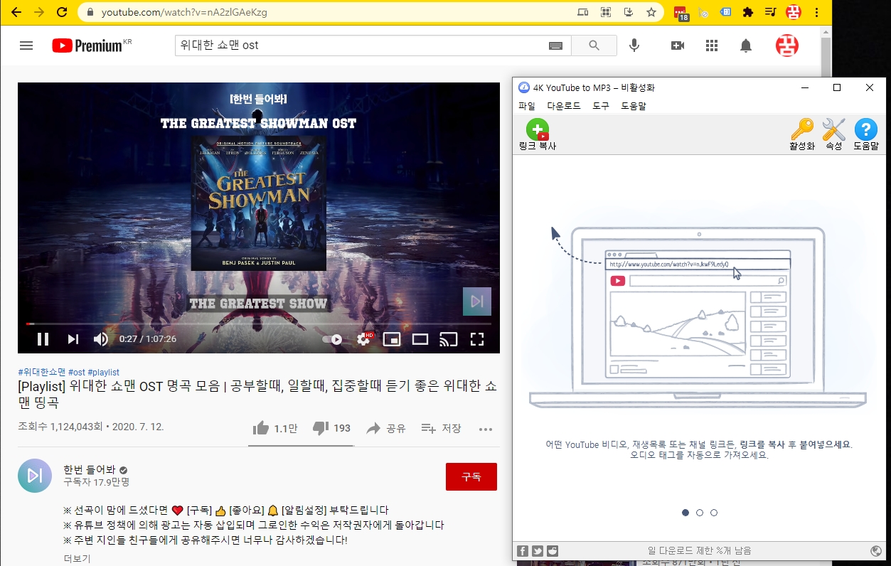 예를 들어서 위대한 쇼맨 OST가 듣고 싶은데 보통의 경우 OST를 구매해서 한 곡 한 곡 청취하거나 특정 곡을 검색해서 유튜브에서 감상하실 텐데요. 유튜브에서는 아래와 같이 전체 OST, 1시간 버전, 4시간 버전 등등 다양한 버전의 음악을 만날 수 있기 때문입니다. 이 파일들을 음원으로 다운로드 받아서 MP3플레이어 또는 컴퓨터, NAS에 저장해 두고 언제든지 쉽게 재생할 수 있습니다.