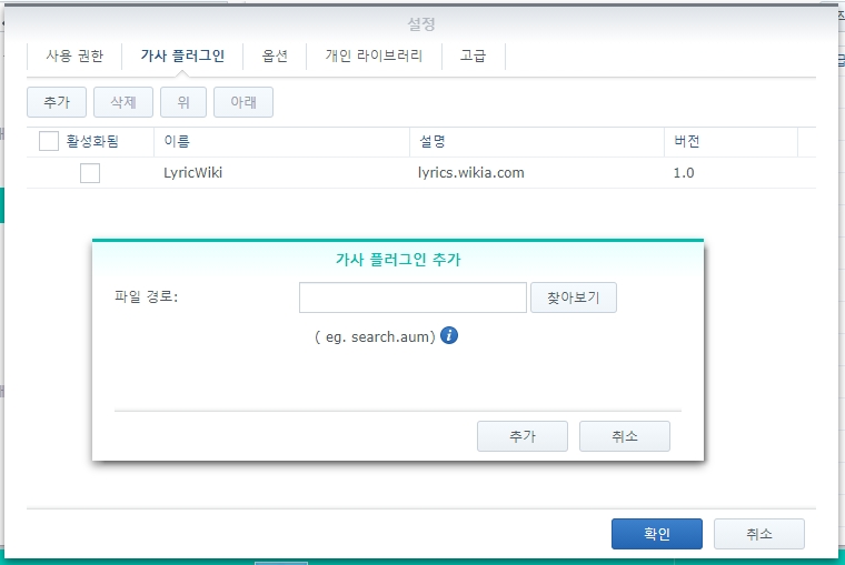 NAS 웹페이지 접속 후 '오디오 스테이션' > '설정'을 클릭해줍니다. 두 번째 탭 '가사 플러그인'을 보시면 오디오 스테이션에 기본적으로 세팅되는 lyricWiki 한 개만 활성화되어 있는 것을 볼 수 있습니다. 왼쪽 위 '추가'탭을 눌러줍니다.
