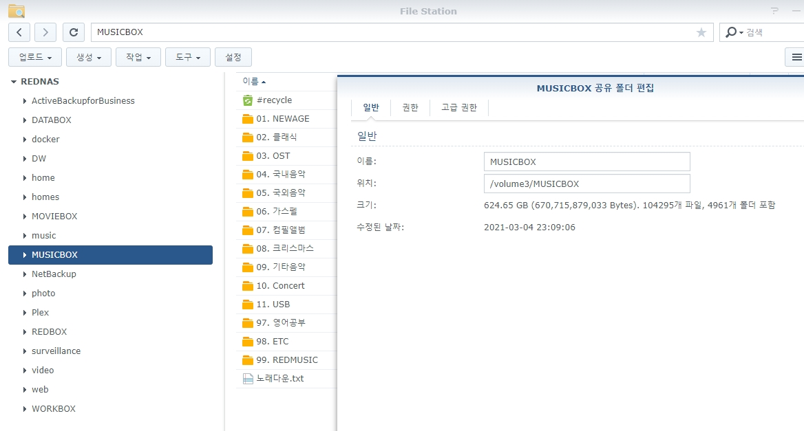 필자의 경우 NAS를 음악과 영상 플랫폼으로 적극적으로 활용하고 있습니다. 보시는 것처럼 폴더별로, 유형별로 정리된 음악 파일만 무려 5,000여 개 폴더, 파일로 약 10만 개가 넘어섭니다. 집안에서나, 집 밖에서나, 차에서나 거의 365일 시놀로지 오디오스테이션과 함께 생활을 하고 있는데요.