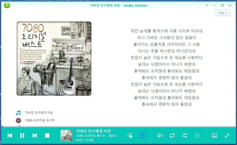 일부의 경우를 제외하고 NAS에 태그정리 없이 음악 파일을 일단 넣어놓는 것이 중요하니 아래와 같이 앨범 커버도, 가사도 없는 음원을 재생하게 될 것입니다. 오디오 스테이션에 내장되어 있는 리릭 위키 플러그인은 라이선스가 요구되어 가사 일부만 표시된다고 하는데 이 마저도 외국곡 중심이기도 하며, 곡 매칭도 잘 안되어 가사가 아예 안 보이는 경우가 허다합니다.