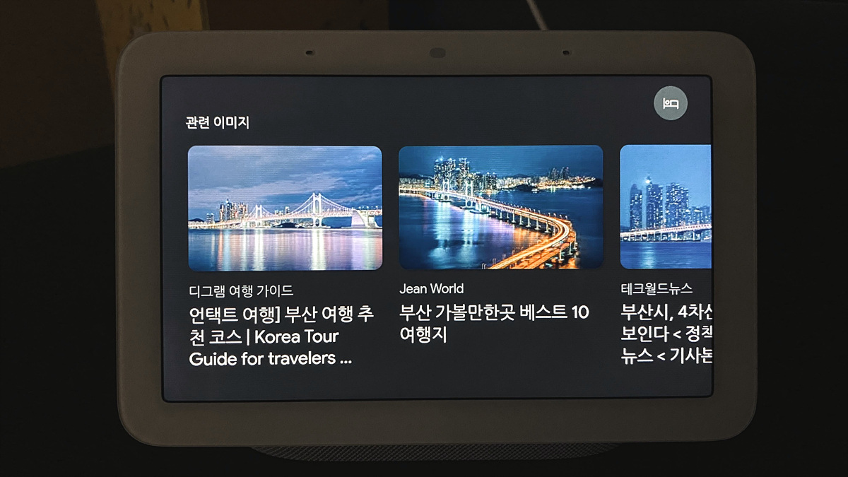 구글 네스트 허브는 단순히 유튜브와 유튜브 뮤직만 검색해주는 기기가 아닙니다. 네스트 허브를 소개하는 블로그 정보를 봐도 이 기능을 왜 소개 안 하는지 모르겠을 정도로 알려져 있지 않더라고요. '부산 사진 찾아줘' 같은 일반 웹의 정보도 찾아줍니다. 물론 현재까지는 관련 '이미지 카테고리'에서 검색과 엄선된 결과값만 노출해주는 것이지만 구글 검색과 동일하게 검색 리스트를 제공해주고 심지어 클릭을 하면 각종 뉴스, 블로그 본문으로 접속까지 가능케 해줍니다.