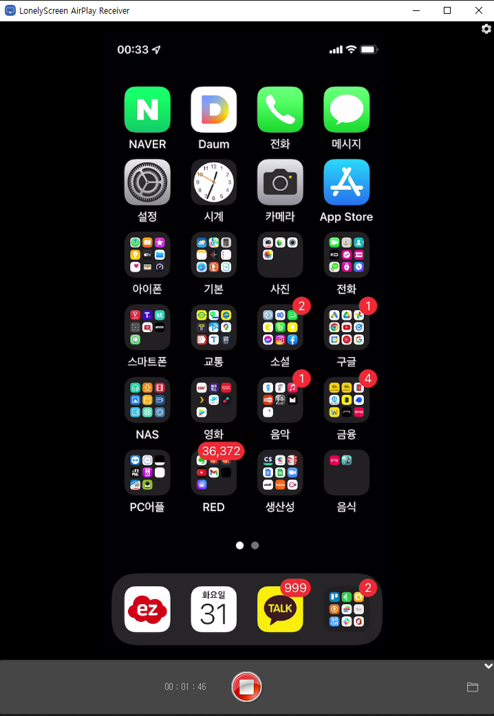 이제부터 아이폰의 모든 화면과 음성, 영상이 노트북 lonelyScreen 창을 통해 똑같이 보입니다. 아이폰 기본 화면부터 카카오톡, 카카오톡의 동영상까지 음성을 포함해서 원활하게 노트북으로 재생됩니다.