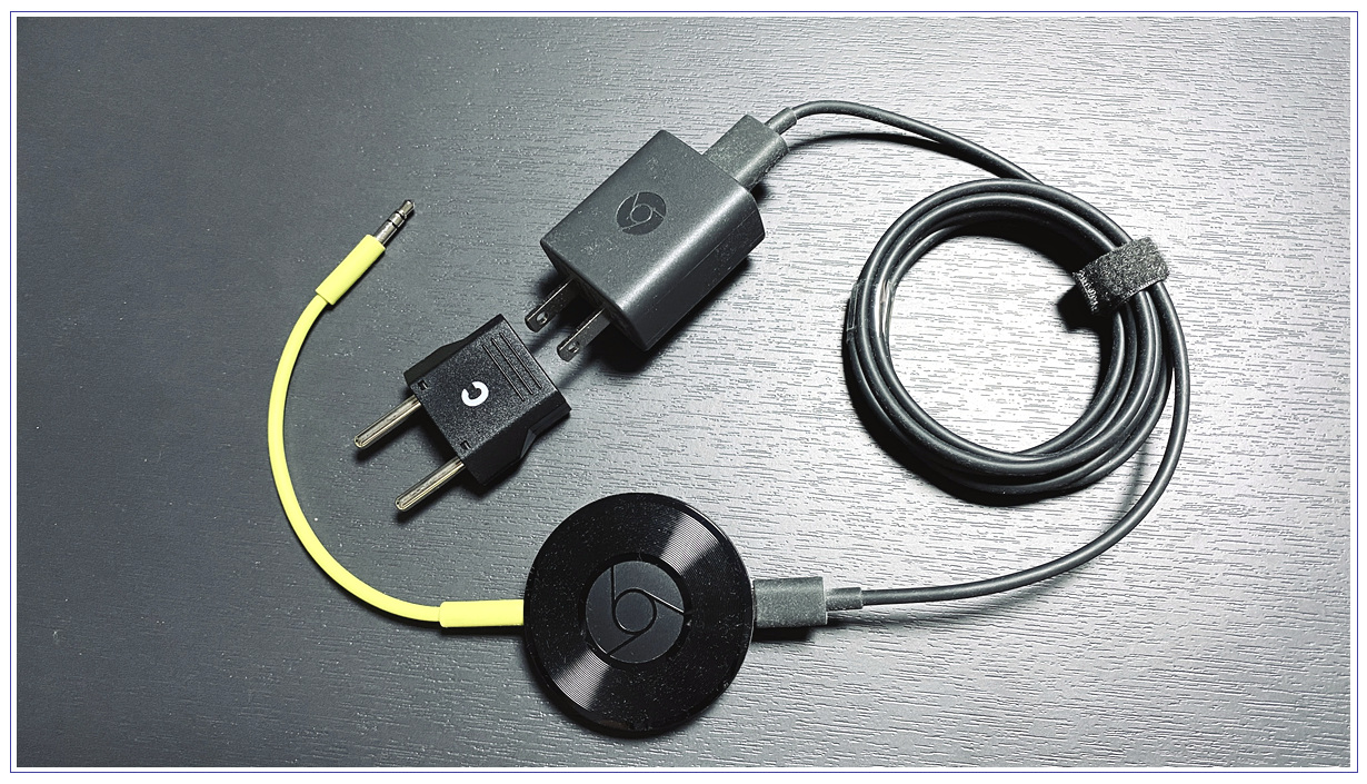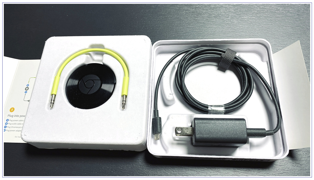 박스를 개봉하면 구글크롬캐스트 오디오 본체, 3.5mm 오디오 연결선, 5핀 USB 케이블과 110v 전원선이 들어 있습니다. 110v전원 어댑터의 경우 집에 굴러다니는 220v 돼지코를 연결하시면 되겠습니다.
