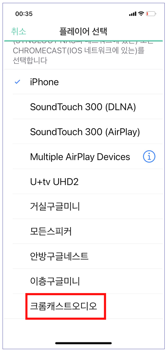 개인적으로 유튜브 뮤직보다 더 많이 활용하는 어플이 바로 시놀로지 NAS에서 제공하는 오디오 스테이션입니다. 호환성이 좋아서 크롬캐스트, DLNA, AIRPLAY 등 다양한 확장 편의성을 제공해줍니다. 마찬가지로 크롬캐스트 오디오를 선택하면 시놀로지 오디오 스테이션의 음악을 크롬캐스트로 재생할 수 있습니다.