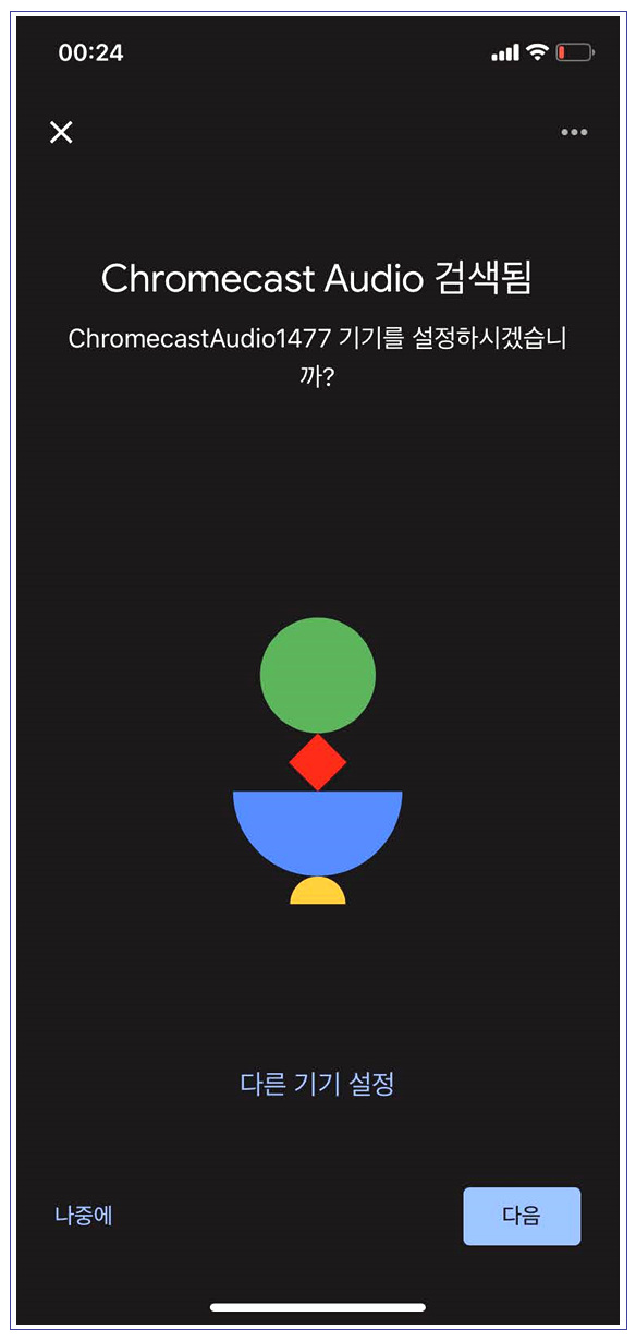 크롬캐스트 오디오는 구글 홈과 연동이 반드시 필요한데 크롬캐스트 오디오에 전원을 연결하고 구글 홈을 실행시키면 정상적으로 동일한 네트워크에 속해있으면 자동으로 기기를 찾아서 'Chromecast Audio 설정' 알림이 뜹니다.
