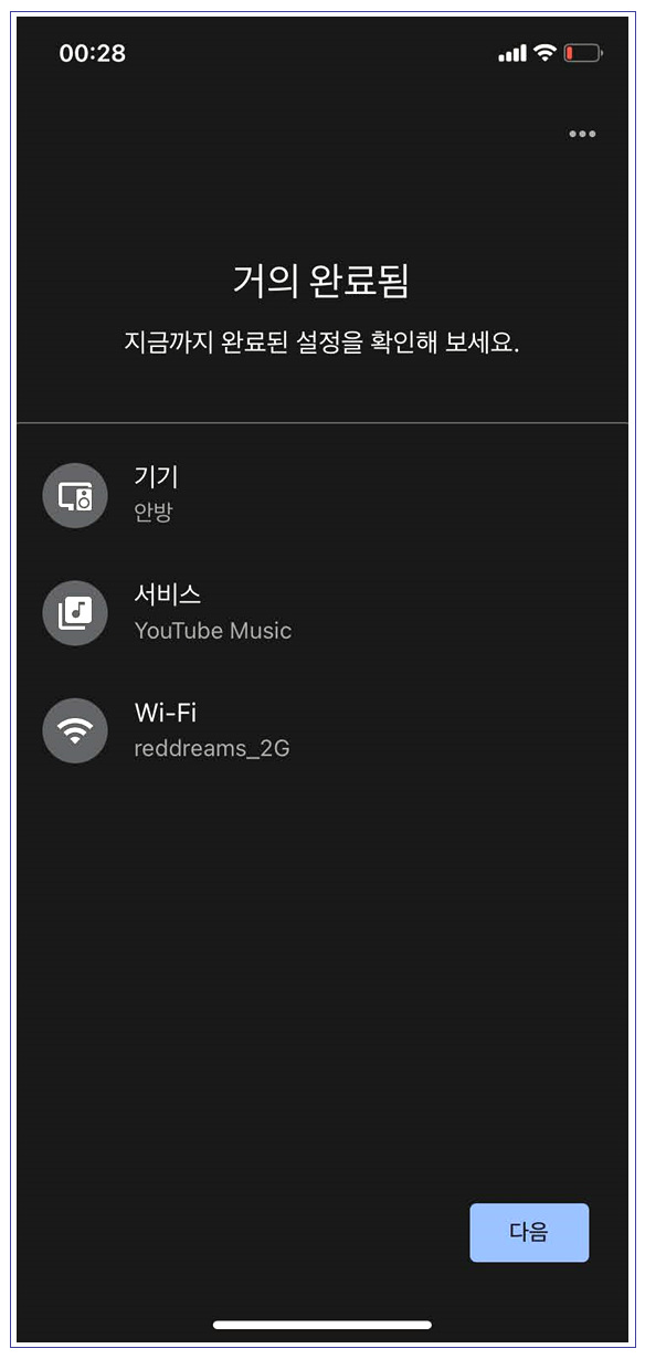 크롬캐스트 오디오가 위치한 장소, 기본 음악 플레이어, 와이파이를 선택한 후 다음버튼을 눌러주면 나머지 작업이 진행됩니다. 크롬캐스트 오디오는 5 Ghz 와이파이도 지원이 가능하나 구글 홈을 구성하는 구글 미니, 구글 네스트 허브 등 모든 IoT 기기들은 가급적 2.4 Ghz 와이파이로 세팅을 해주시는 것이 좋습니다.