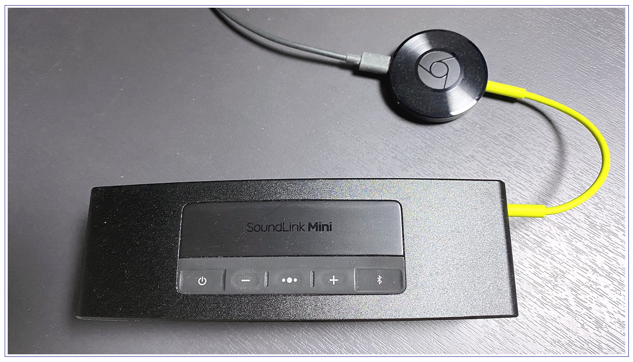 이번에는 조금 더 쉽게 구현이 가능한 상황입니다. 보통 집에 블루투스 스피커 한 대씩은 있을 텐데요. 필자 역시도 BOSE SOUNDLINK MINI라는 블루투스 스피커가 있습니다. 다행히 이 스피커에는 외부 입력을 위한 3.5파이 단자가 존재하는데요. 이 단자에 크롬캐스트 오디오를 물려놓았습니다. 앞서 블루투스는 반드시 음원 손실이 발생한다고 했죠? 그런데 스마트폰에서 음악을 블루투스로 안 쏴주고, 크롬캐스트 오디오로 쏴주면 어떻게 될까요? 캐스팅을 해줬으니 스마트폰은 이제부터 다른 음악 재생, 통화 등 자유롭게 활용이 가능합니다. 더욱이, 블루투스 통신이 아니라 크롬캐스트가 스스로 인터넷 통신으로 음원 소스를 가져와서 유선 케이블로 BOSE 블루투스 스피커로 음악을 쏘아주죠? 당연히 음원의 손실 또는 지연이 발생되지 않습니다. 또한, 크롬캐스트 오디오는 출력이 스마트폰에서 제공하는 것보다 훨씬 높습니다. 거의 대부분의 상황에서 스마트폰을 블루투스로 연결한 것보다 훨씬 더 높은 출력을 제공해주게 될 겁니다. (여기까지만 세팅해도 분명 활용도와 음질이 매우 높아지는데 오디오를 공부한 분들이라면 앰프, 광출력 케이블 등을 연결해서 더욱 높은 음질을 뽑아내는 것이 가능합니다.)