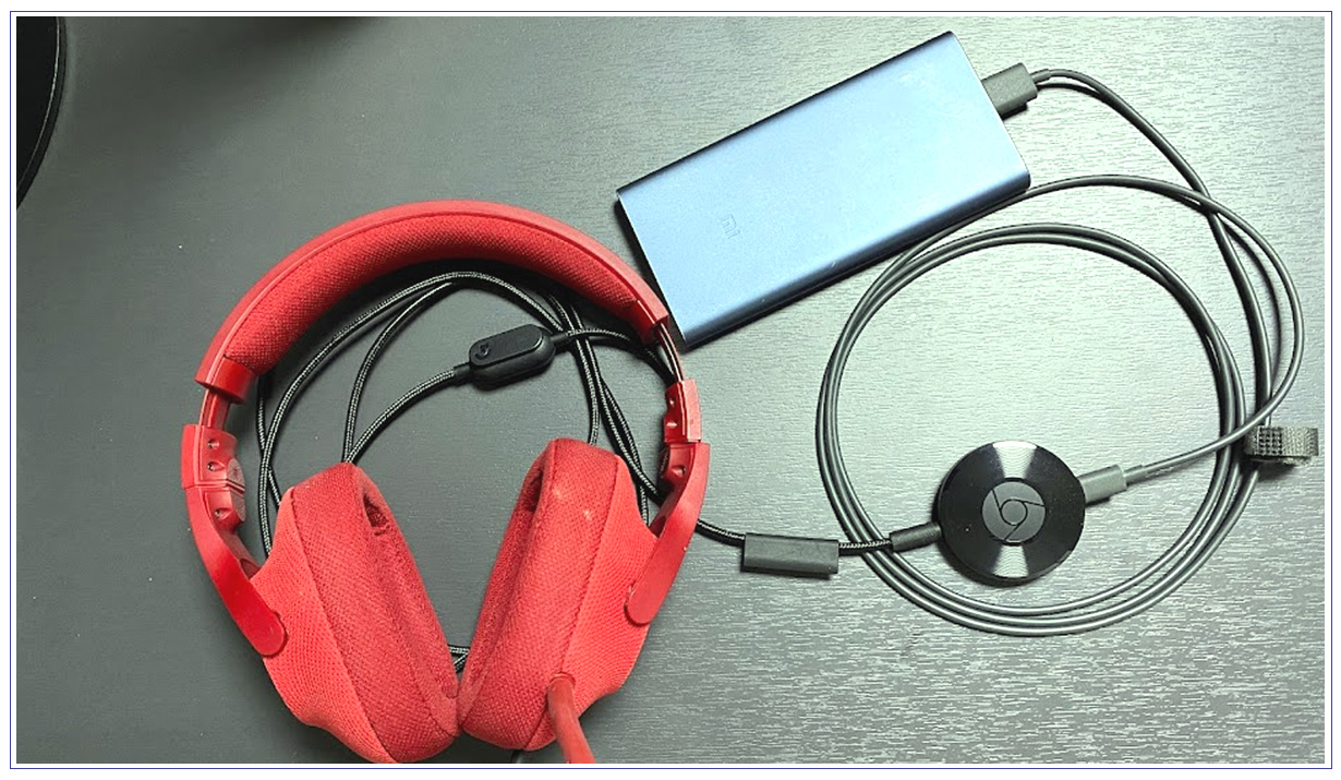 이번에는 응용 버전입니다. 필자의 집에는 유선 헤드폰이 있습니다. 보통 게임을 할 때 즐겨 사용하는데요. 이 헤드폰의 3.5 오디오 케이블은 보통 컴퓨터의 헤드셋 단자에 연결하게 되는데 이 것을 크롬캐스트로 연결했습니다. 이제부터 이 헤드폰은 스마트폰과 연결된 고음질 무선 헤드폰으로 변하게 된 것입니다.