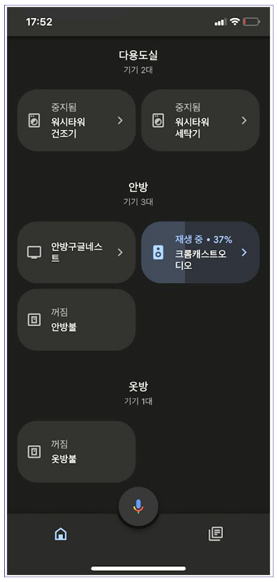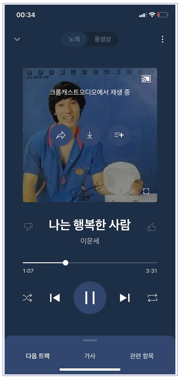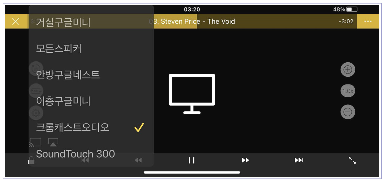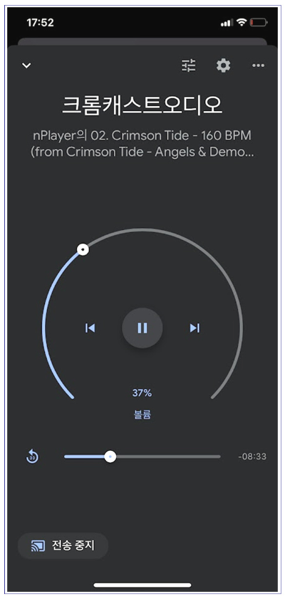 이렇게 스마트폰 등을 통해 원하는 음악을 크롬캐스트 오디오로 던져주면 구글 홈 앱 크롬캐스트 오디오가 정상적으로 명령신호를 받고 재생이 되고 있음을 확인할 수 있습니다.