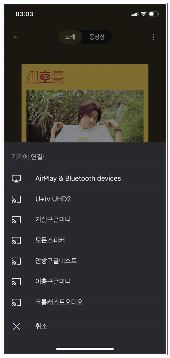 당연하겠지만 유튜브 뮤직은 크롬캐스트 오디오의 기본 음악 서비스입니다. 유튜브 뮤직은 에어플레이, 크롬캐스트, 블루투스 등 다양한 재생 편의성을 제공해줍니다. 필자는 집에 구글 미니 2대, 네스트 허브 1대, 스마트 TV, 스마트 사운드바 등 오디오 기기가 많아서 생각보다 많은 장치들이 보이는데요. 구글 홈에 크롬캐스트 오디오가 정상 설치되어있다면 아래와 같이 크롬캐스트 오디오 연결 버튼도 보이게 됩니다. 이제부터 모든 유튜브 뮤직의 음악을 크롬캐스트로 청취할 수 있습니다.