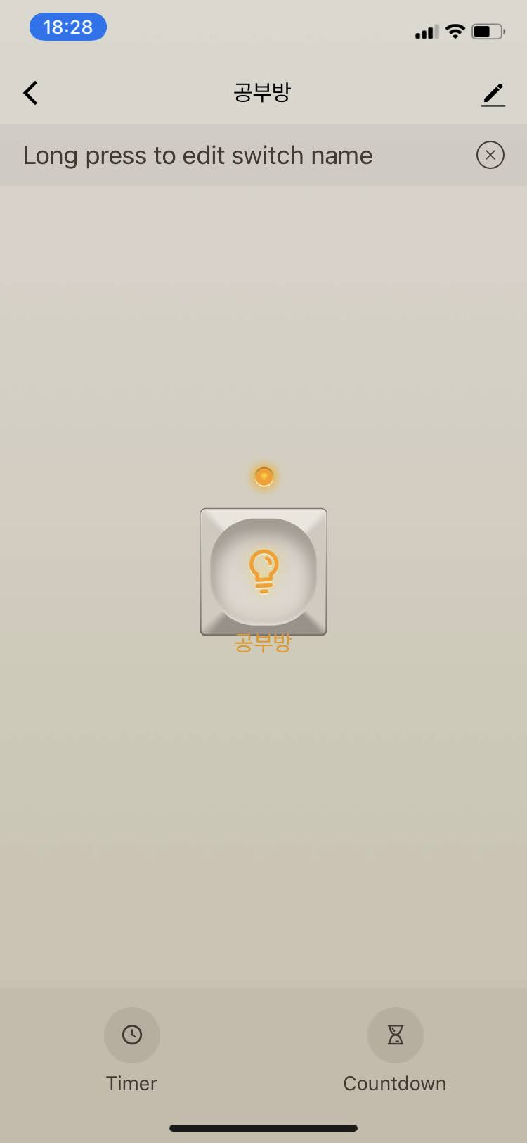 자 이제 모든 등록이 끝났습니다. 투야 앱에서 '공부방'이라는 스위치가 생성되었네요. 클릭을 하면 바로 스위치 조작 화면으로 넘어가게 됩니다. 이 화면에서는 해당 스위치가 1 구라면 1개의 아이콘이, 3 구라면 3개의 아이콘이 뜨게 될 겁니다. 현재 상태를 보니 공부방의 불이 켜져 있네요. 터치하면 불이 꺼지고, 또 터치하면 불이 켜집니다.