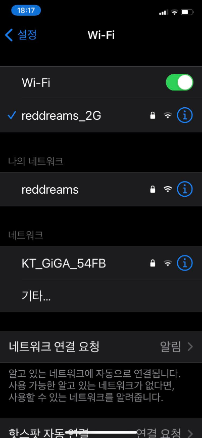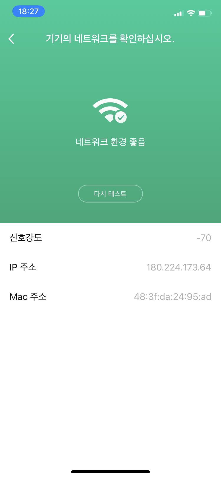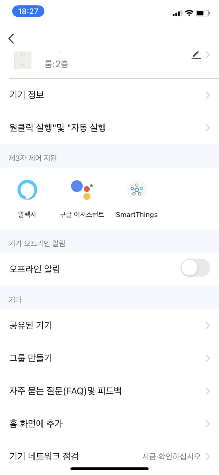 등록된 기기 정보를 보면 기기오프라인 알림, 원클릭 실행 및 자동실행 기능을 만들 수도 있고, 홈 화면에 추가하는 기능들도 있습니다. '기기 네트워크 점검'을 눌러보니 아래와 같이 네트워크 환경 좋음이 뜹니다. 만약에 네트워크 환경이 좋다고 뜨지 않는다면 해당 스위치와 와이파이가 불안정하게 연결이 된 것이니 와이파이 환경을 점검해보실 것을 권해드립니다.