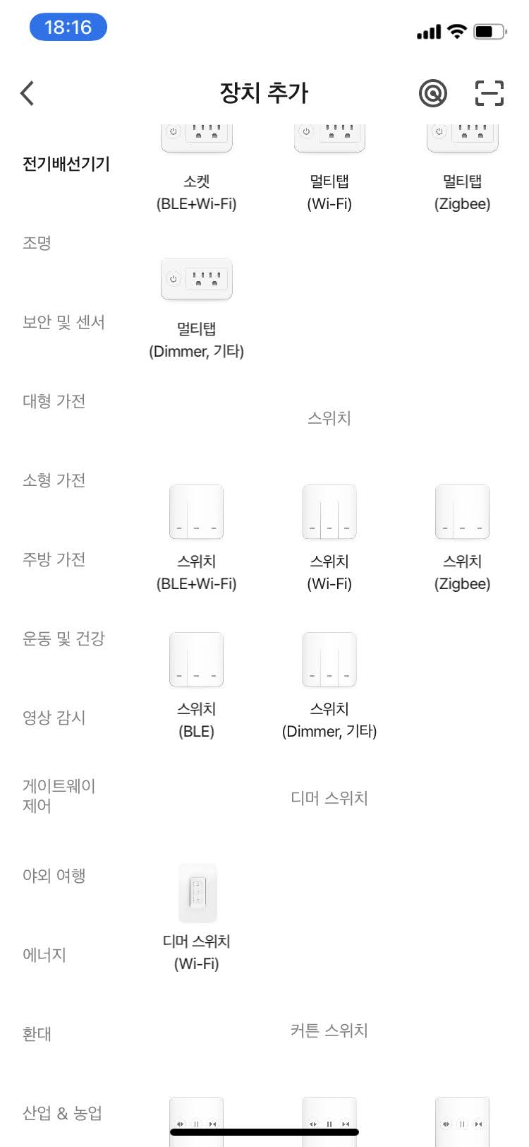 투야 스마트 앱은 아래와 같이 생겼습니다. 현재는 기기가 없을 것이라 아래처럼 장비들이 보이지 않을 텐데요. 가볍게 +버튼을 눌러서 '장치 추가'를 클릭해줍니다. 그 후 전기배선기기 > 스위치(Wi-Fi)를 클릭합니다.