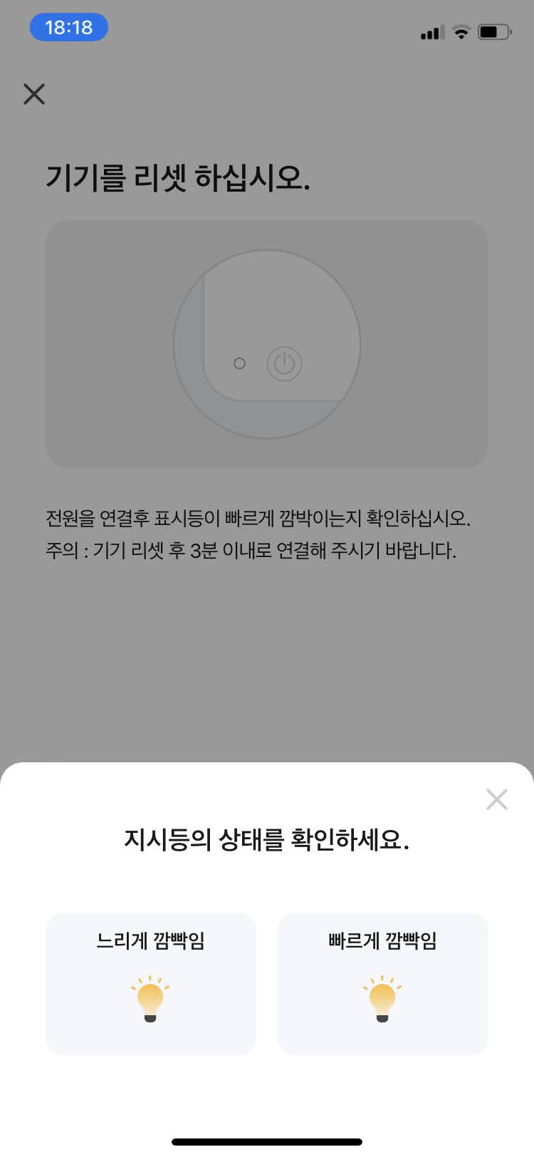 앞서서 이미 스마트폰의 와이파이를 2.4 Ghz로 변경했기 때문에 특이사항이 없다면 바로 적용이 되어 있을 겁니다. 다음 버튼을 누릅니다. 그리고 기기를 리셋하라고 나오는데 우리가 방금 설치한 스위치의 버튼을 8초 동안 꾹 누르고 있으면 리셋이 됩니다. 정상적으로 리셋이 되었다면 본 게시물 첫 번째 사진처럼 와이파이 아이콘이 주황색으로 깜빡이게 됩니다.