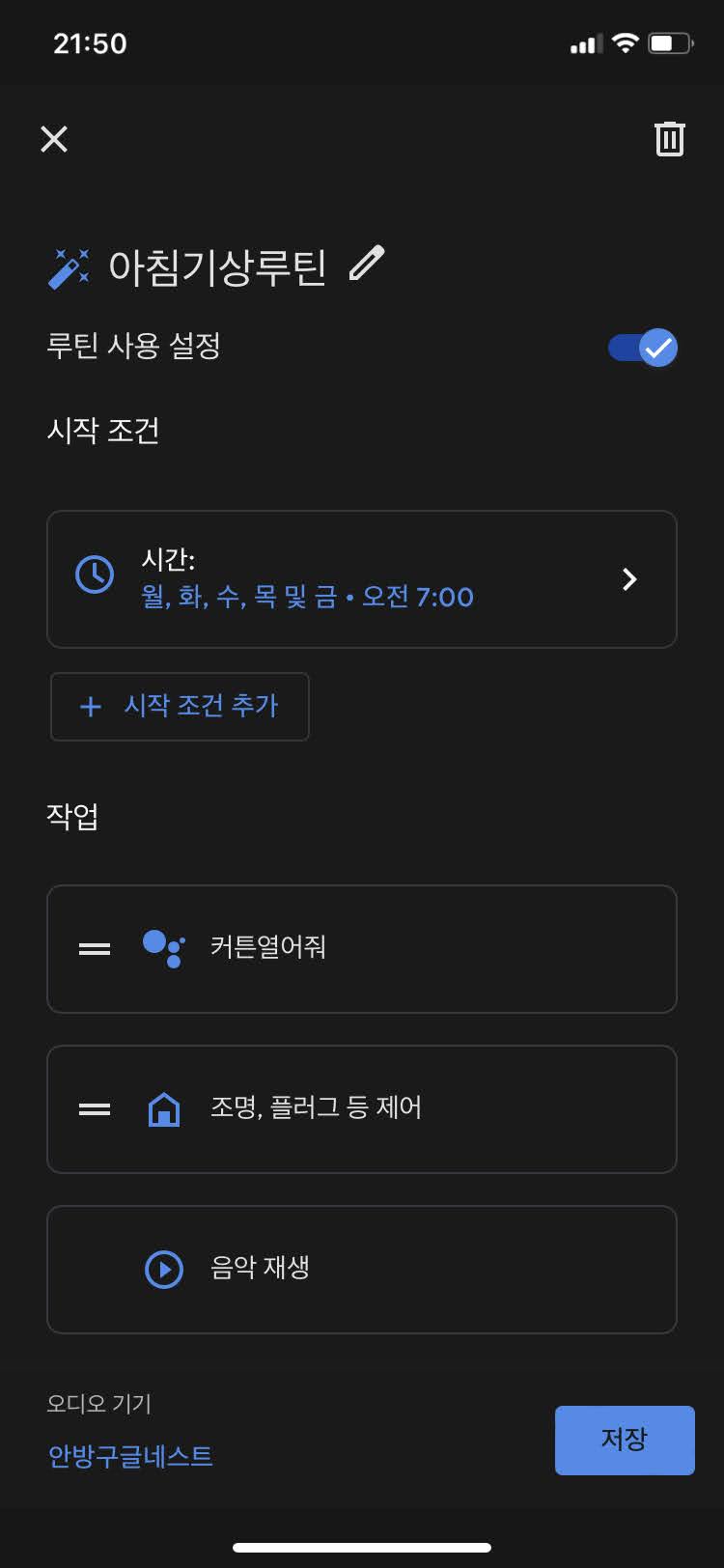 음성으로 집안 언제 어디서나 손하나 까딱하지 않고 불을 제어할 수 있고, 집 밖에서도 불이 켜져 있는지 확인하고 끄고 켜는 것이 가능해졌습니다만, 스위치를 바꾸는 가장 큰 목적 중 하나 바로 루틴 설정이겠죠? 구글 홈이 제공하는 루틴 기능에서 특정 시간 또는 특정 조건을 설정한 후 '조명, 플러그 등 제어'를 눌러보면 구글 홈에 연동된 모든 등 기구가 표시됩니다. 원하는 대로 자유롭게 설정하시면 됩니다. 필자는 기상시간에는 특정 시간을 지정해서 자동으로 불이 켜지도록 세팅했으며, 취침시간에는 '구글~ 나 잔다' 등의 음성 루틴을 설정해서 불을 끄는 스마트 라이프를 즐기고 있습니다.