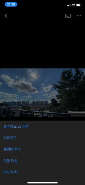 백업된 사진은 마치 구글 포토를 보는 것처럼 시간 순서대로 혹은 폴더 순으로 장소까지 함께 표현되면서 노출됩니다. 사진을 선택하면 슬라이드 쇼 재생, 다운로드, 앨범에 추가, 이동, 복사 기능을 수행할 수 있습니다. 아래 크롬캐스트 기능을 볼 수 있듯이 에어플레이와 크롬캐스트를 통해서 TV에서 사진과 동영상을 감상하는 것도 전부 제공합니다.