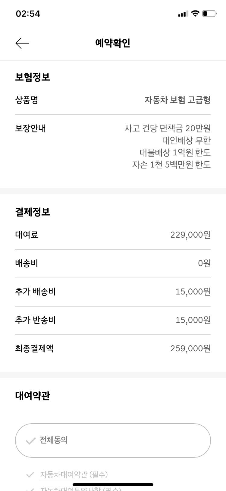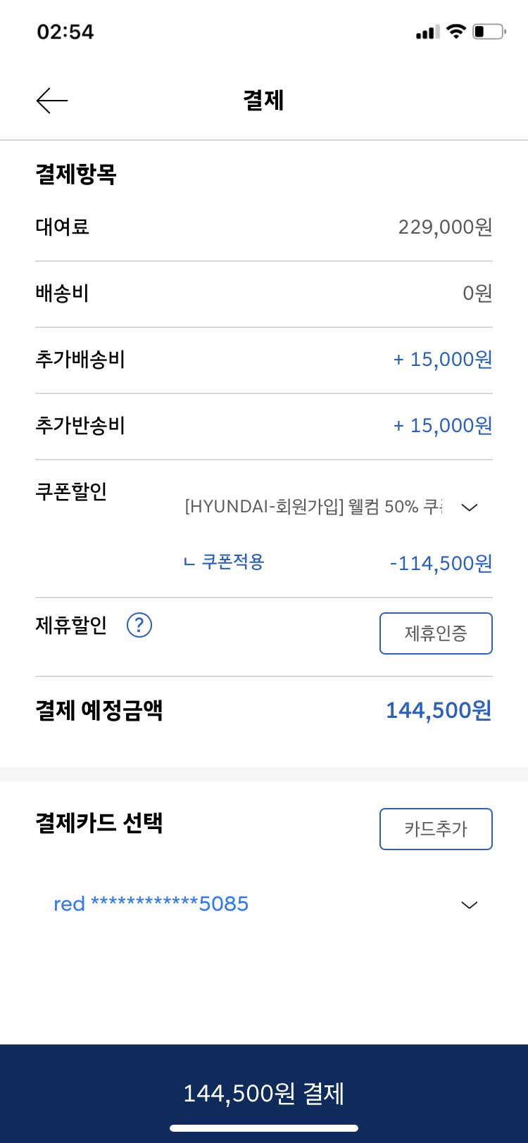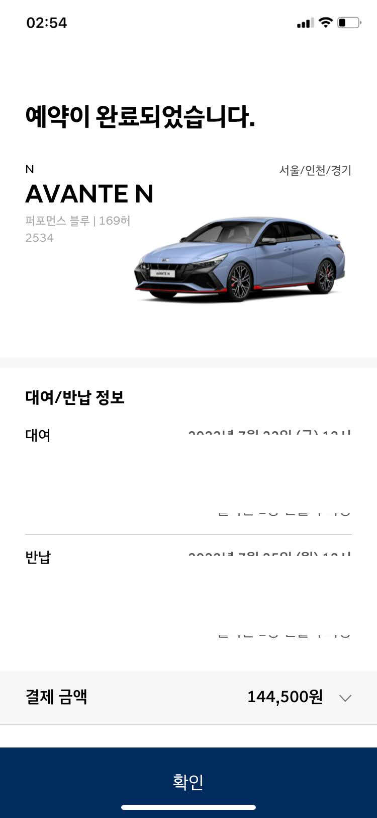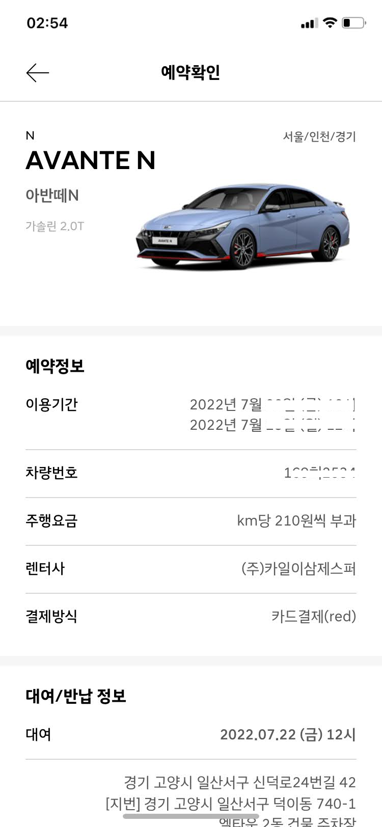 자 이제 결제 단계만 남았네요. 만약에 50% 할인 혜택이 제공되지 않았다면 분명 이용하지 않았을 테지만... 우리들에겐 신규가입 50% 할인쿠폰이 있습니다. 대여료의 50%인 무려 114,500원이 할인됩니다. 배송 및 반송을 포함하여 72시간 기준 아반떼 N을 144,500원에 예약했습니다. 아반떼 N이 무려 4천만 원 대의 퍼포먼스 차량이고 아직까지는 어디에서도 렌트를 할 수없다는 점을 감안해보면 이 정도면 매우 큰 메리트인 듯합니다. 이렇게 예약이 마무리되었고 이제 차량이 오고 타보는 일만 남았습니다.