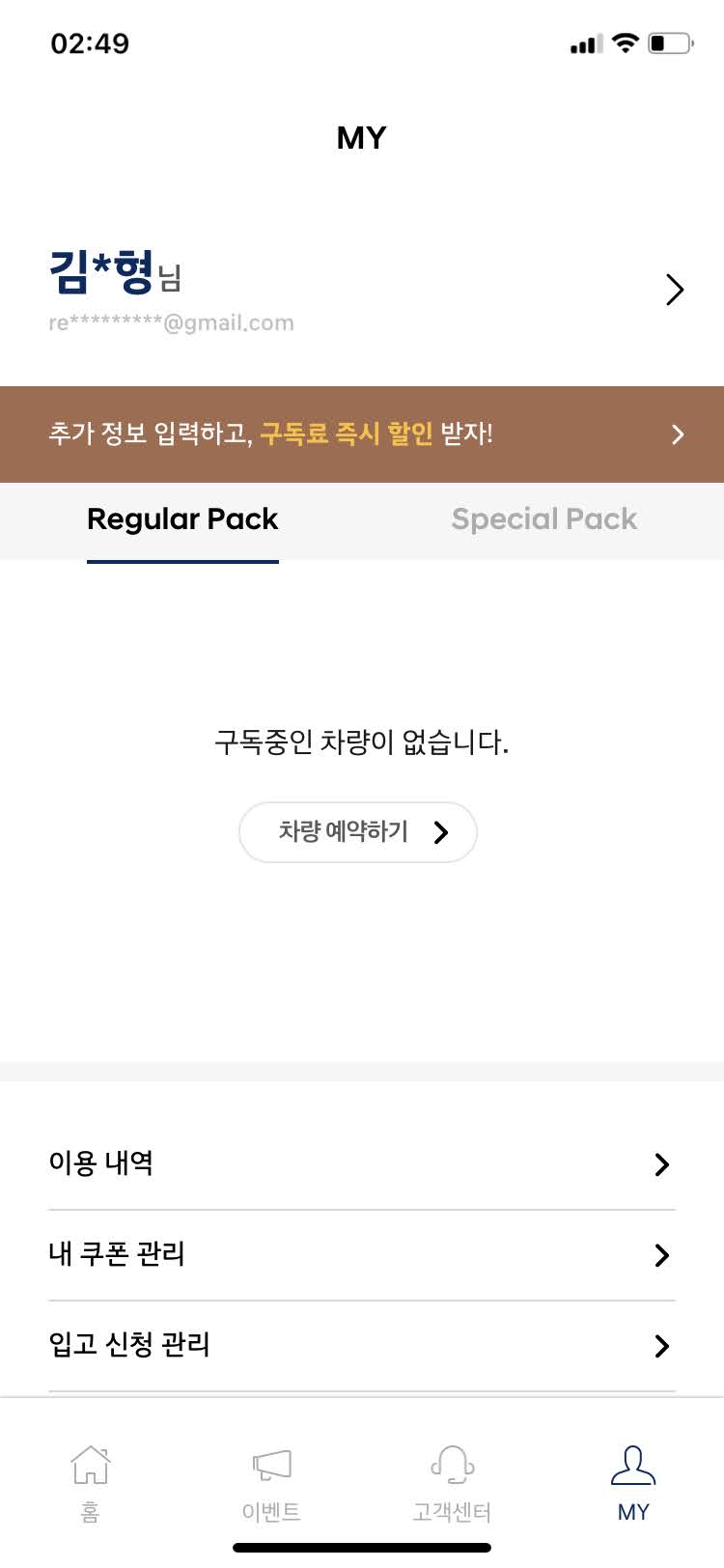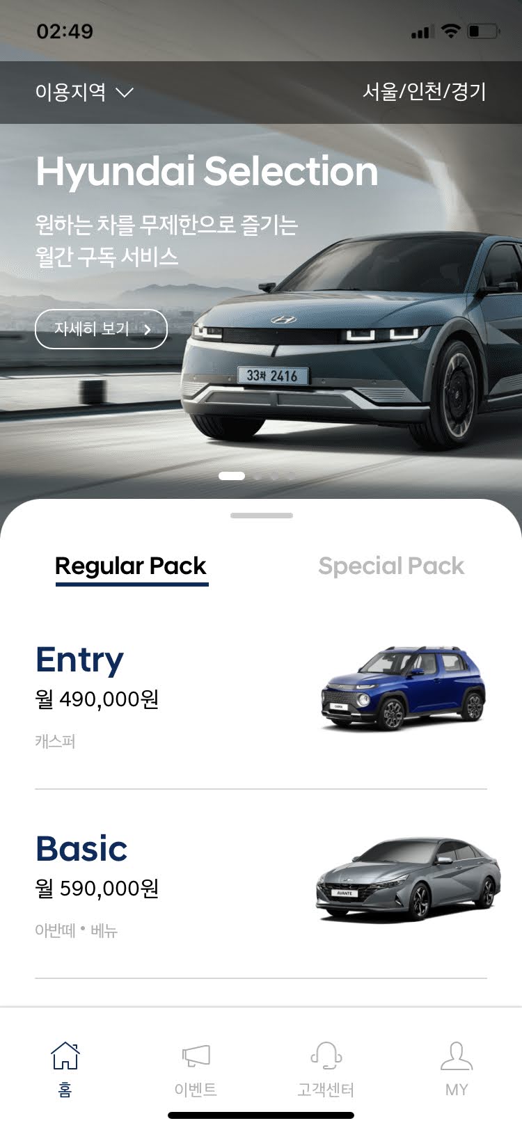 구독 서비스인 만큼 구독 모델에 포함된 차량을 월 1회 기준으로 자유롭게 교체하면서 탈 수 있습니다. 다만, 베이식 까지는 캐스퍼, 아반떼, 베뉴 3가지 차량이고 스탠더드가 되어야 소형, 중형, SUV, 경차가 포함된 구독이 가능하니 스탠더드부터 진정한 차량 구독 개념인 듯합니다. 필자는 월 구독을 검토 중인 게 아니라 단기 구독이라 이 부분은 빠르게 넘어가고 일단 현대 셀렉션 앱에 로그인을 해줍니다.